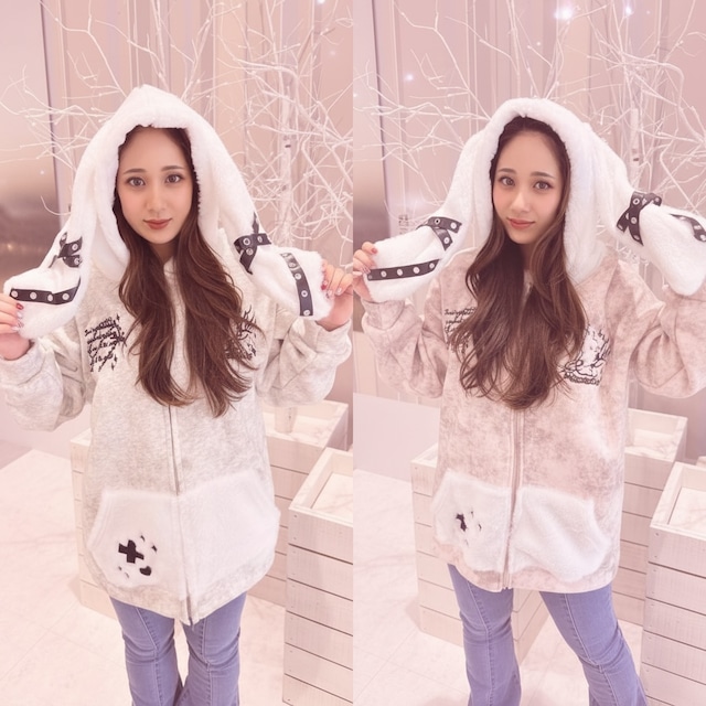 ふわふわのうさ耳フードが目を惹く、存在感抜群のジップアップパーカー。 耳部分にはスタッズ風ベルトデザインを施し、甘さの中にエッジを効かせた地雷系・サブカルテイストな一着です。 フード・ポケット部分は柔らかなファー素材で、見た目も着心地もウォーム感たっぷり。 ゆったりとしたシルエットで体型カバーもしつつ、羽織るだけでコーデの主役に。 サイズ:F
