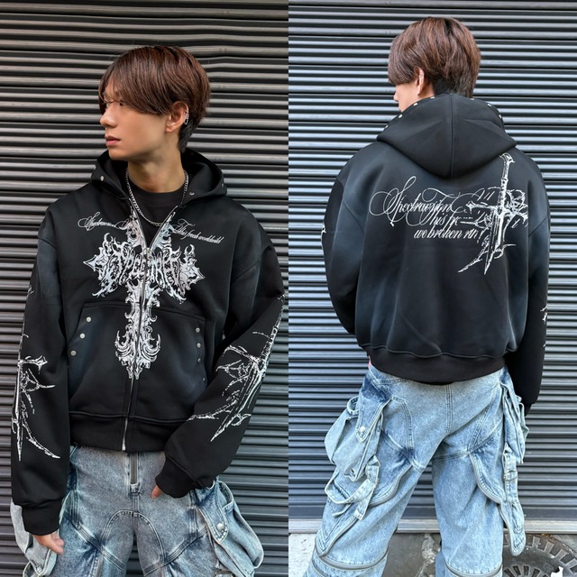 フロントに施したダークゴシックなメタルロゴプリントと、袖に描かれたスケルトンアームの大胆なデザインが存在感を放つジップパーカー。 スタッズの装飾を散りばめたフードがアクセントとなり、1枚でコーデの主役になるアイテムです。