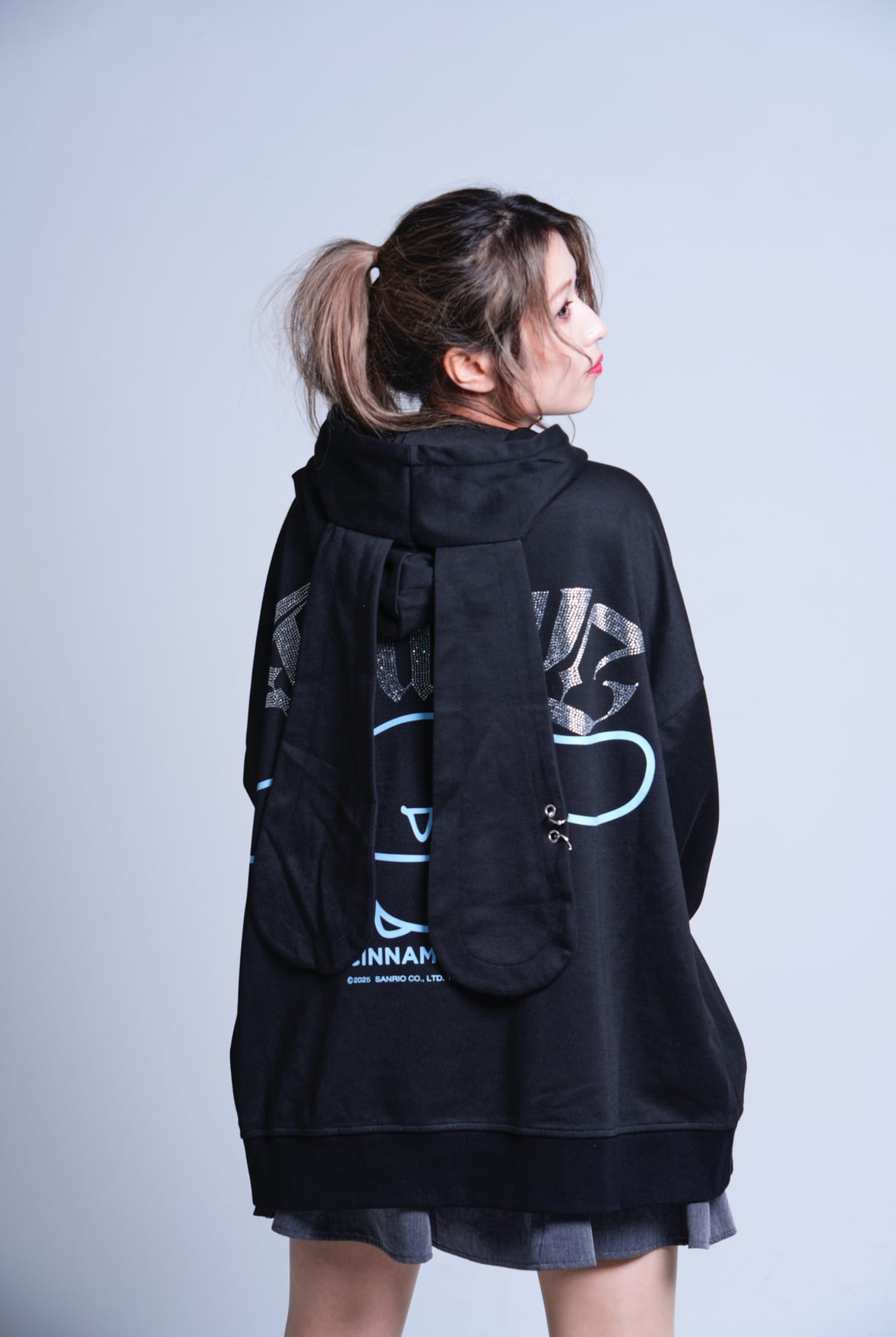 背面に大きくシナモロールのイラストがプリントされており、その上にはスタイリッシュなゴシック調のロゴが配置されています。