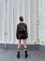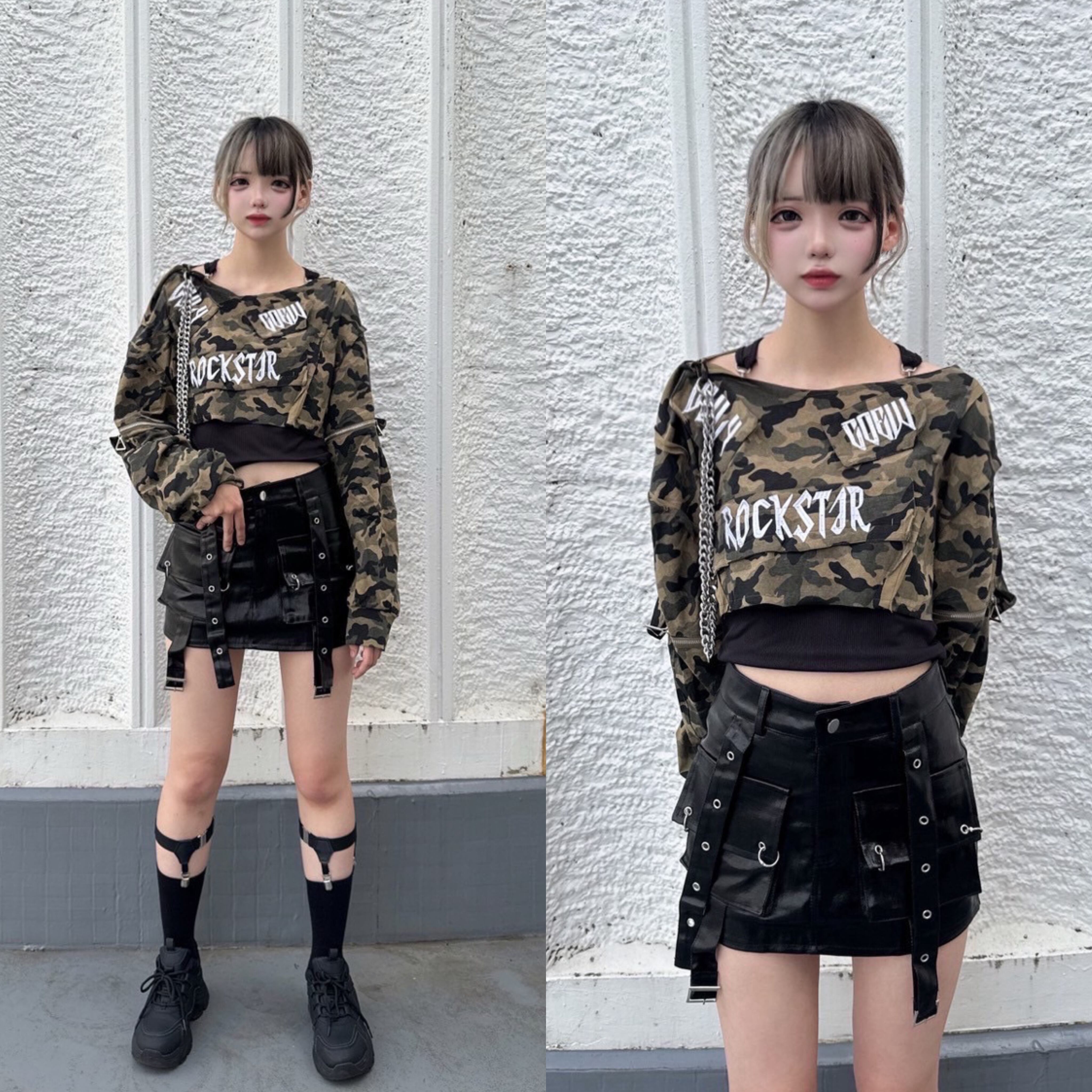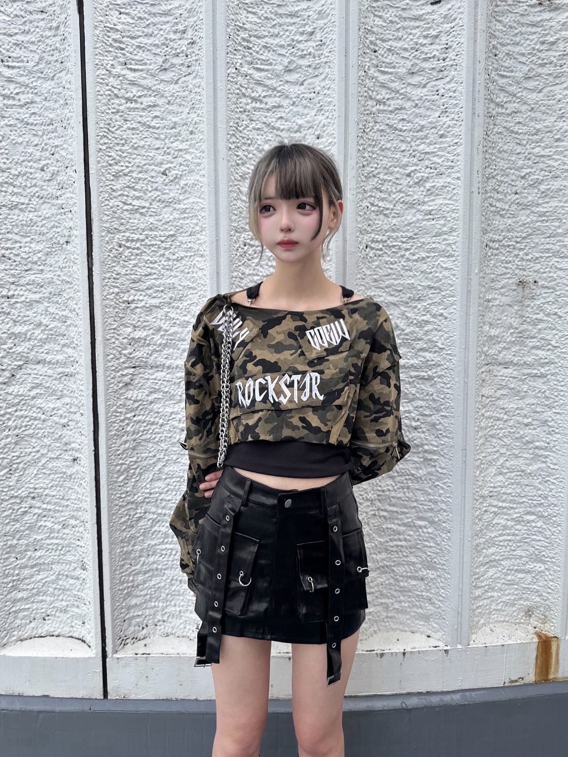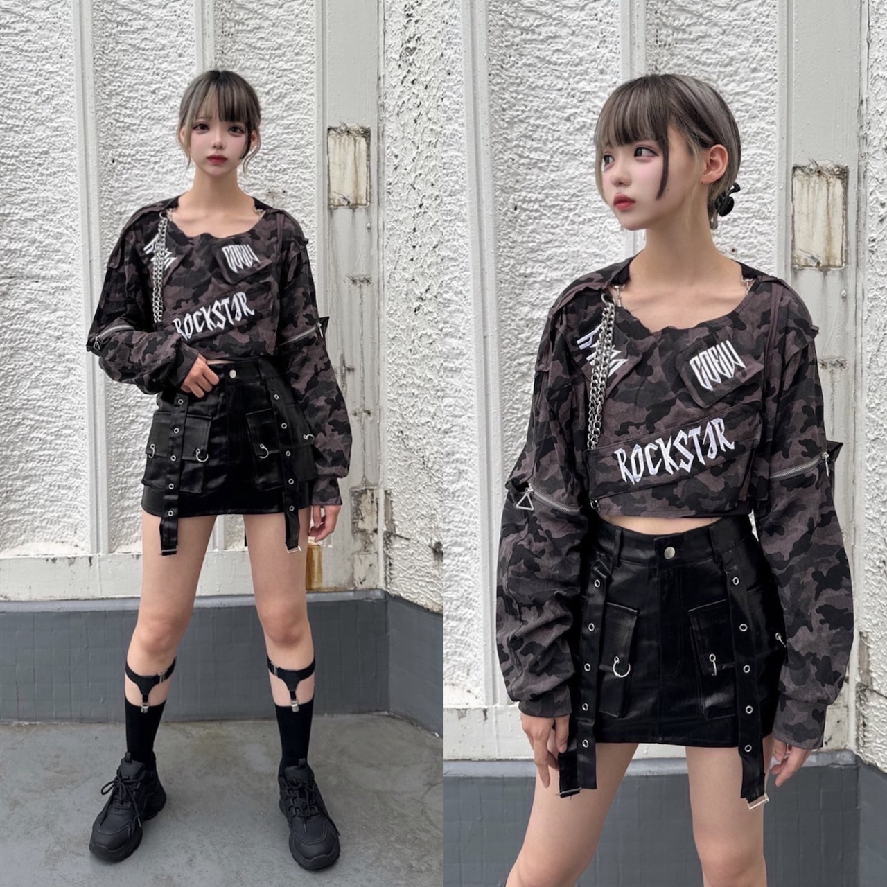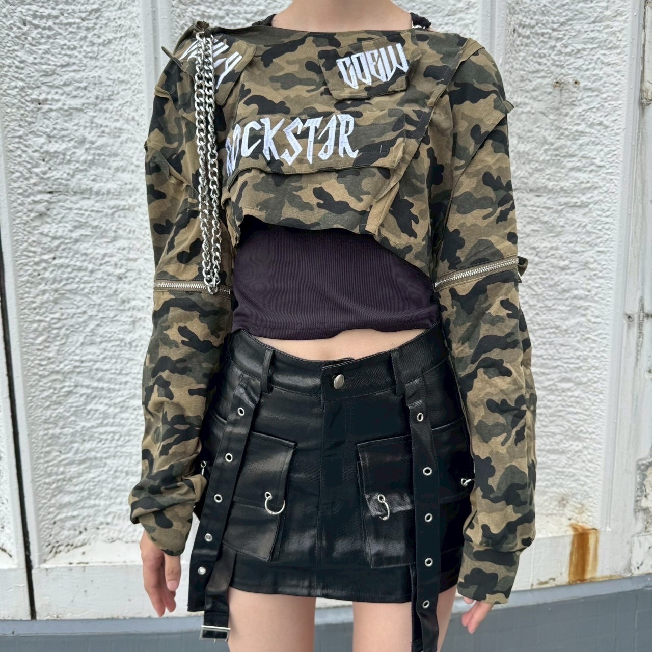 大胆なカモフラージュ柄に、ダメージ加工とロゴプリントを組み合わせたストリート感あふれるクロップドトップス。オフショル風に着られる広めのネックラインが、抜け感と色気を演出します。胸元の”ROCKSTAR”プリントや英字パッチがエッジの効いた印象に。ゆったりシルエットの長袖は、袖口にかけてのルーズな落ち感がこなれた雰囲気をプラス。ミニスカートやカーゴパンツと合わせれば、サブカル・地雷系・パンク系コーデにもぴったりなアイテムです。