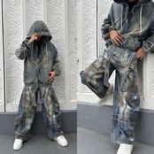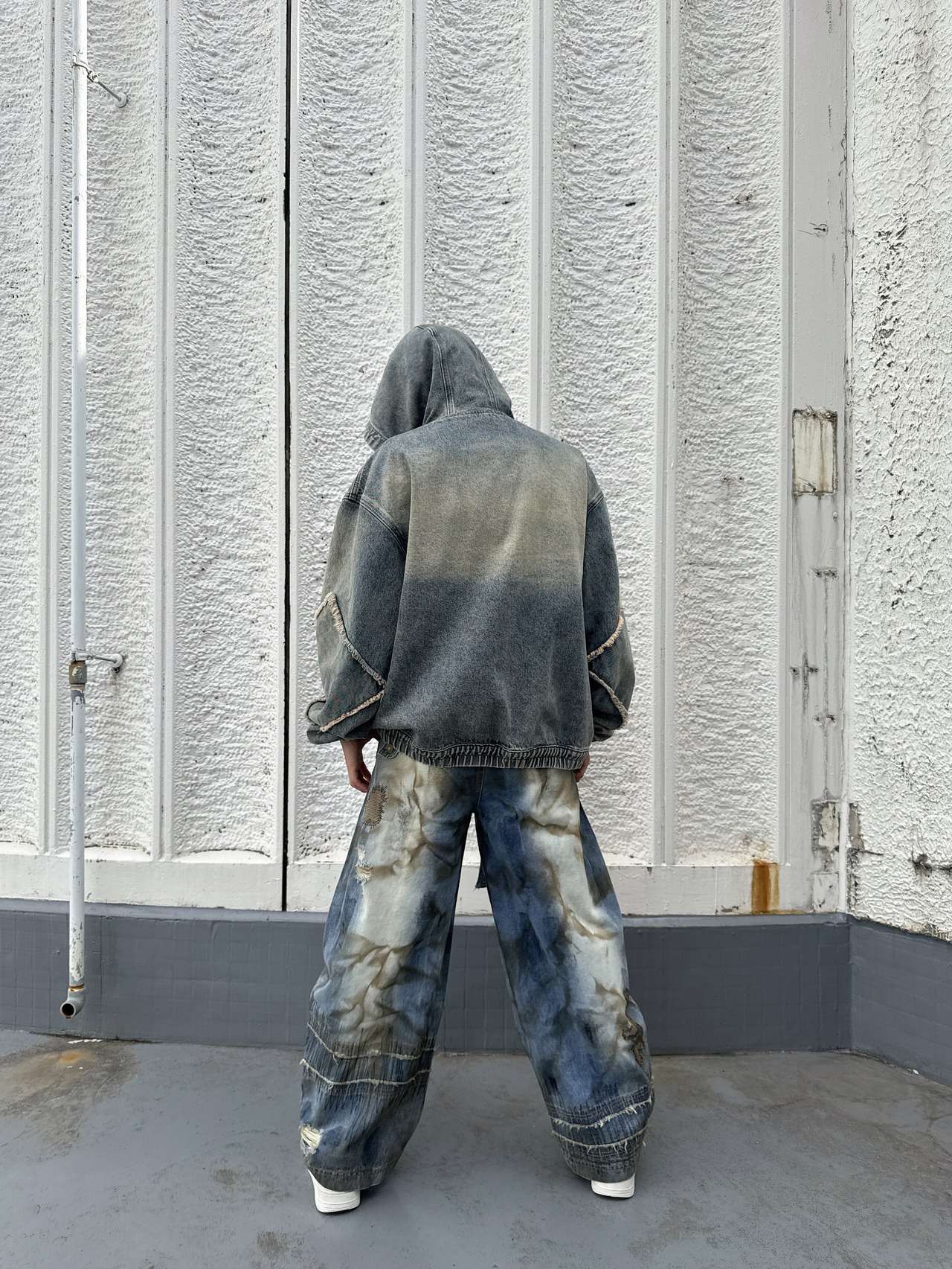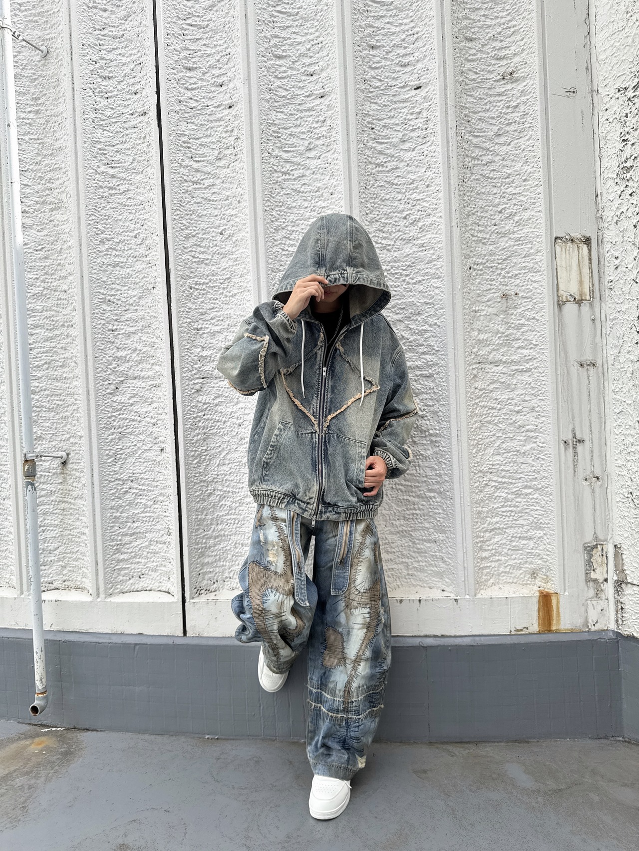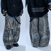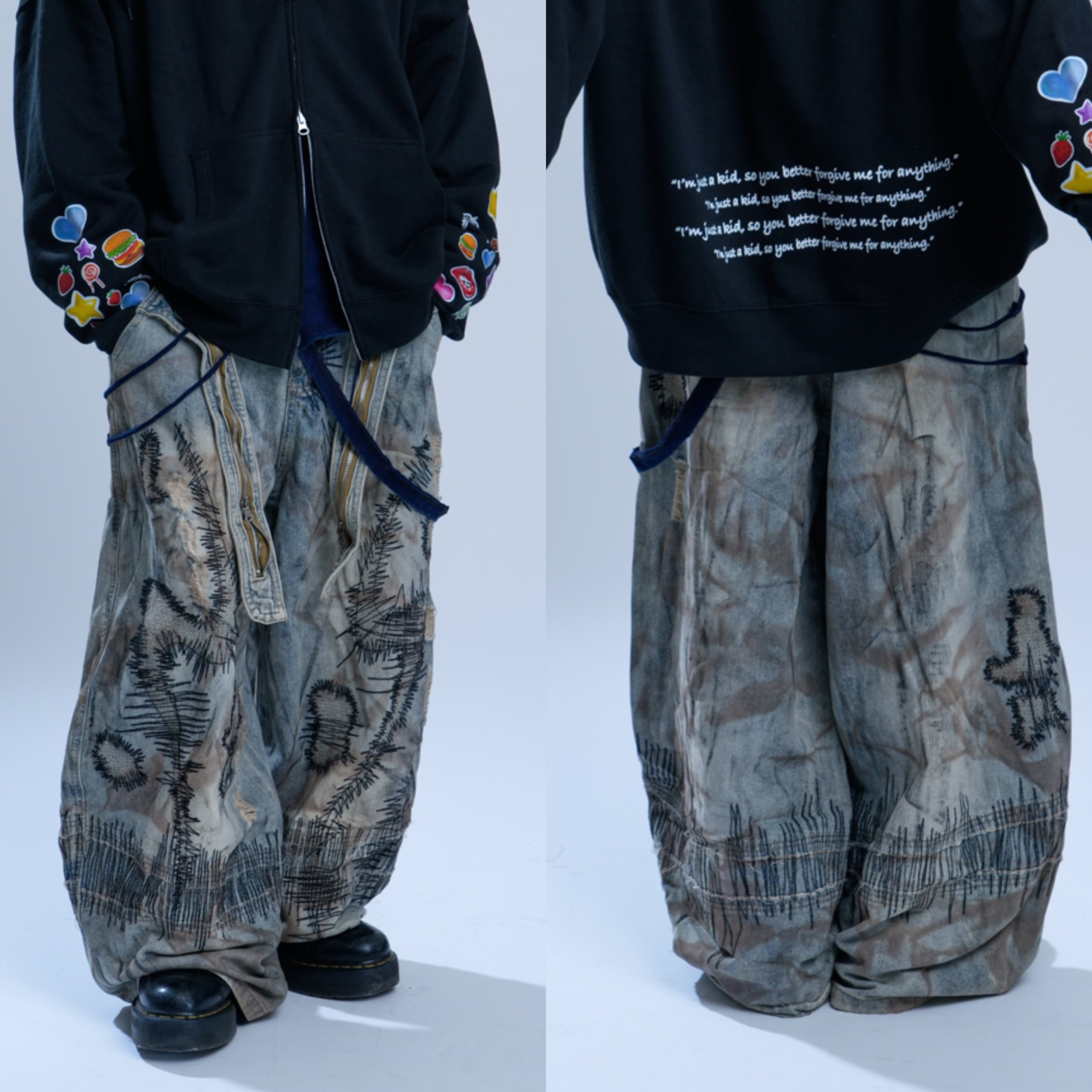 ヴィンテージ感漂うウォッシュ加工と、大胆なステッチワークが特徴的なワイドデニムパンツ。切り替え部分やランダムに施されたほつれ加工が、ラフで無骨な雰囲気を演出します。ゆったりとしたワイドシルエットで、ストリート・韓国系・サブカル系コーデにマッチ。両サイドに配置されたジップディテールがアクセントになり、トップスをインしてもアウトしても映える存在感抜群の一本です。