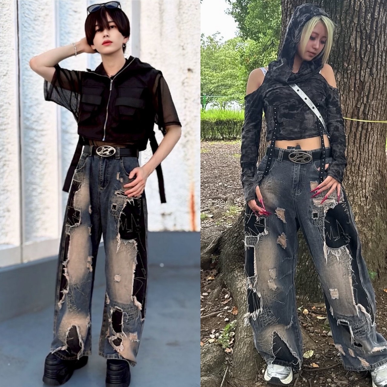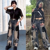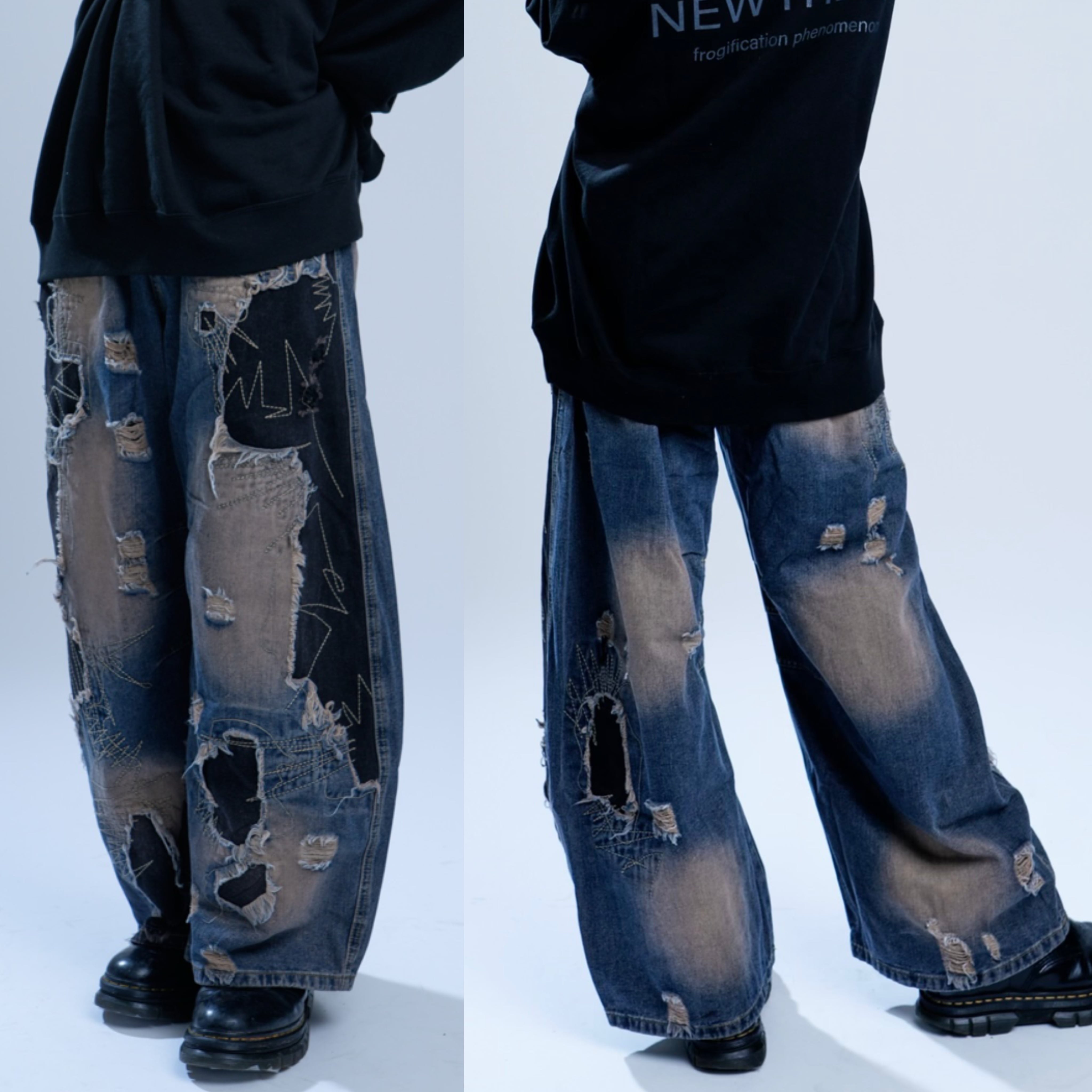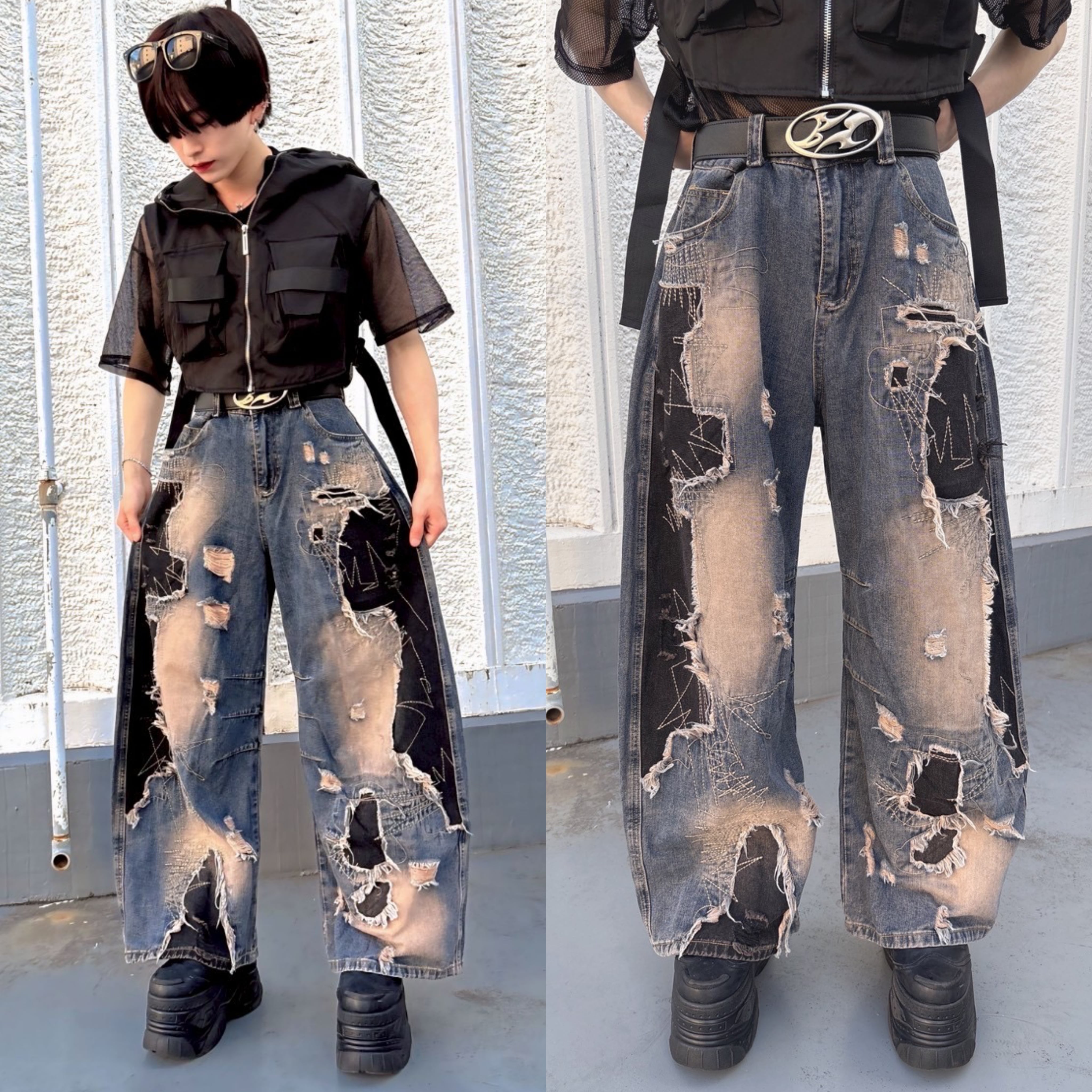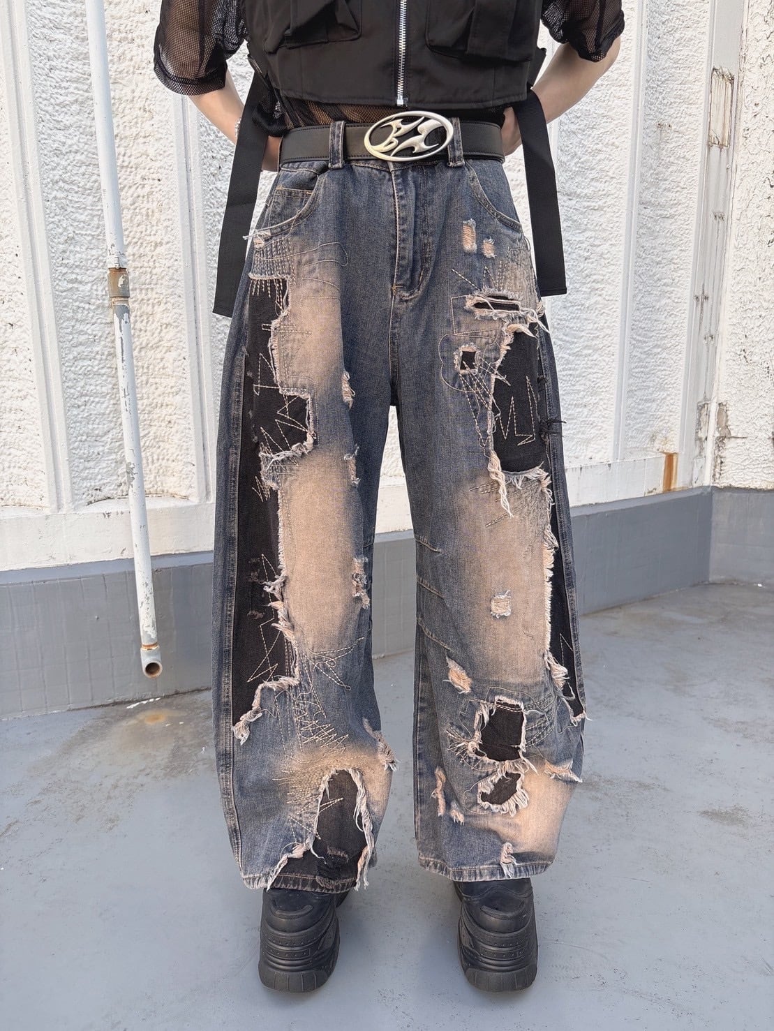 大胆なダメージ加工とブリーチ、ブラック切り替えで仕上げたワイドデニム。無骨さとストリート感を融合し、ユニセックスで着こなせる存在感抜群の一本。
