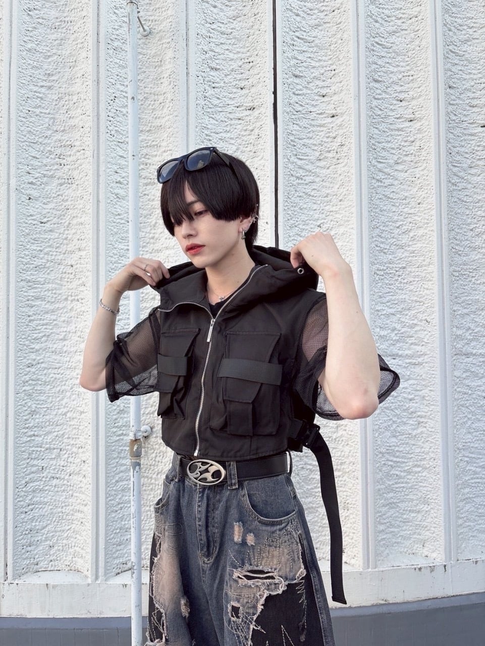 フード付きでカジュアルさをプラスしつつ、シースルー素材が抜け感を演出。ユニセックスで着用可能なアイテムで、サブカル・地雷系・Y2Kスタイルとの相性も抜群です。