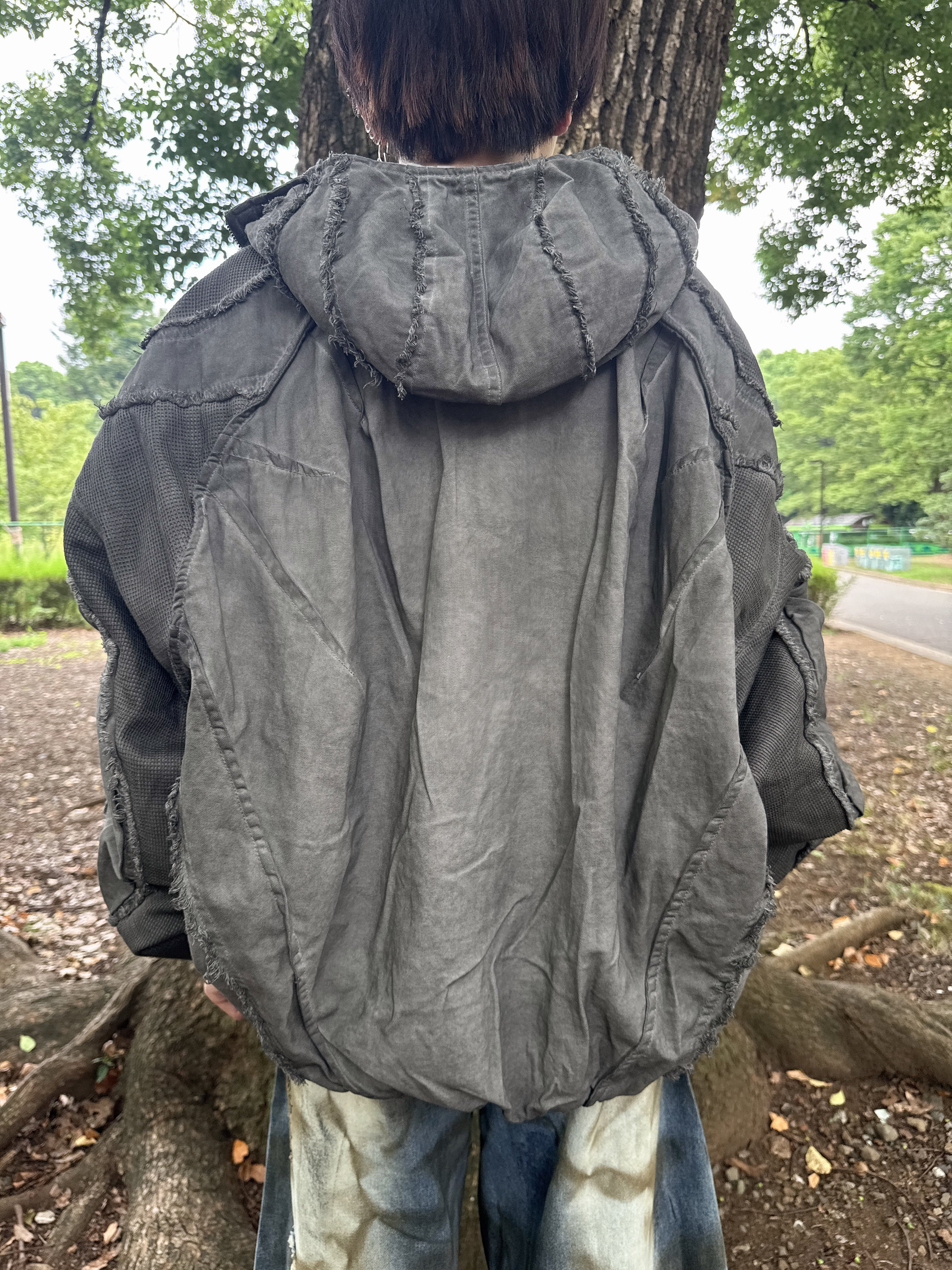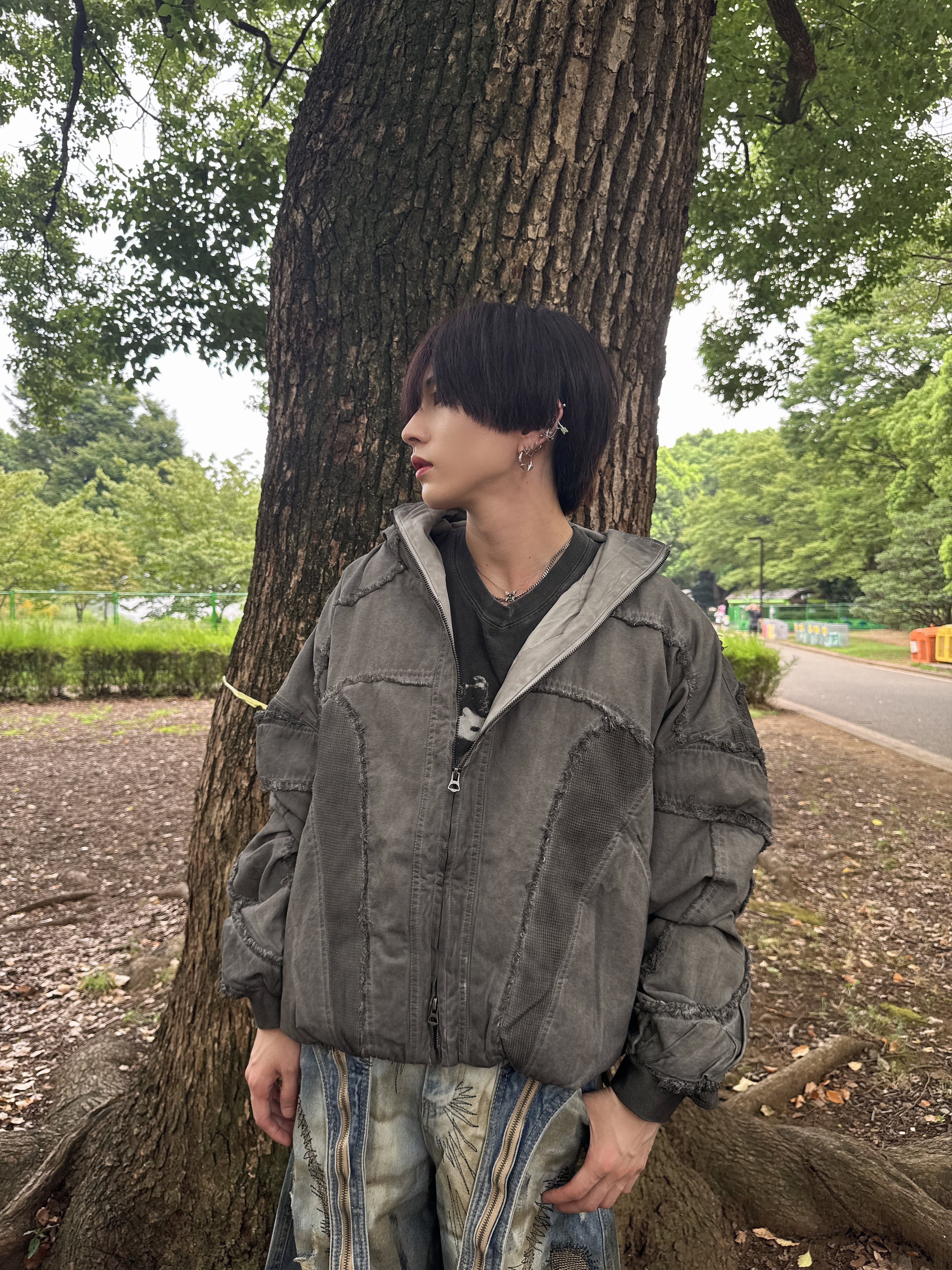 独特な切り替えデザインと、ウォッシュ加工による褪せ感がヴィンテージライクな雰囲気を演出。程よいボリューム感のあるシルエットは、ストリートからモードまで幅広いスタイルにマッチします。フロントはダブルジップ仕様で、着こなしのアレンジも自在。軽やかな着心地ながらも存在感のある一枚です。