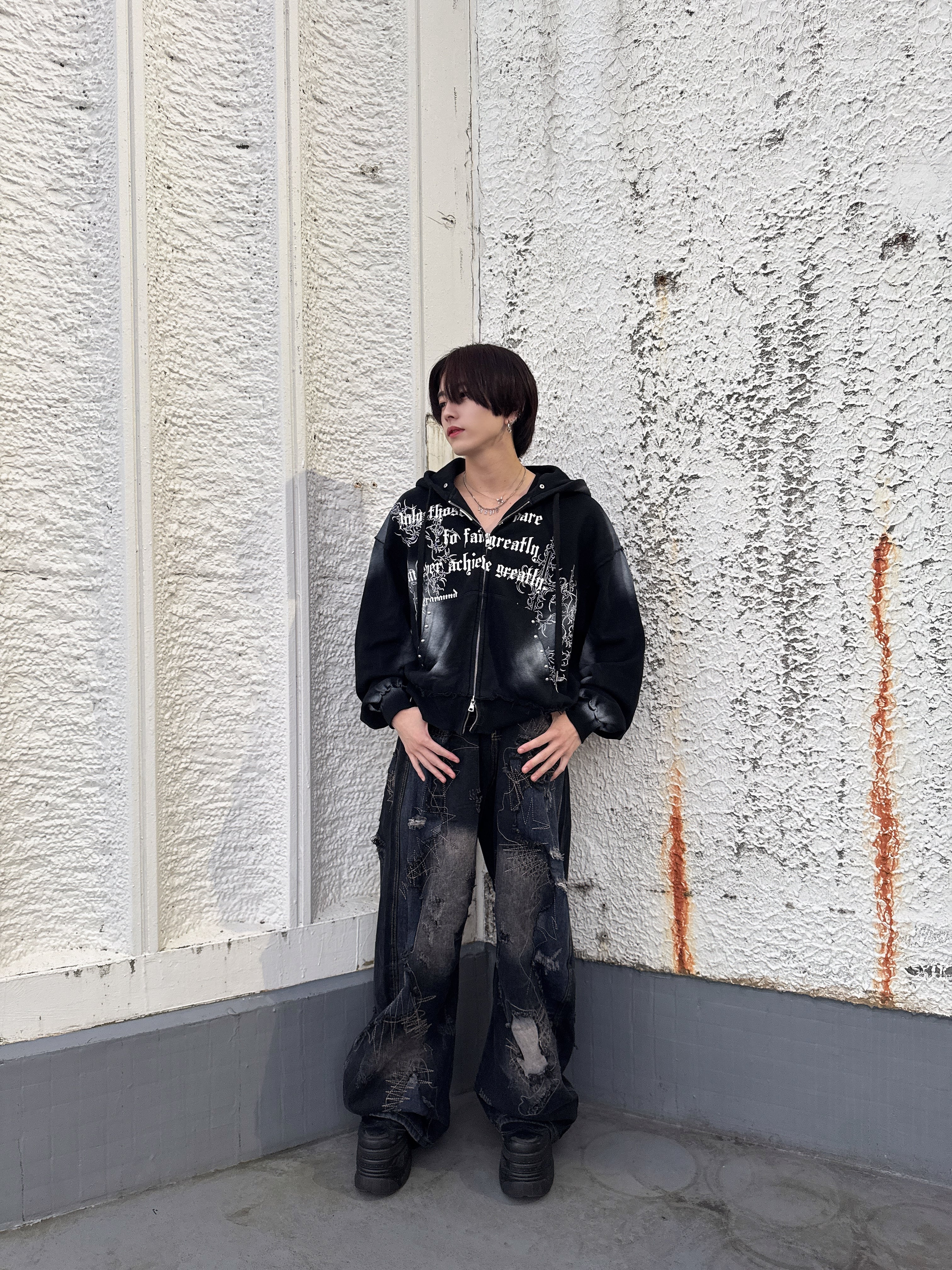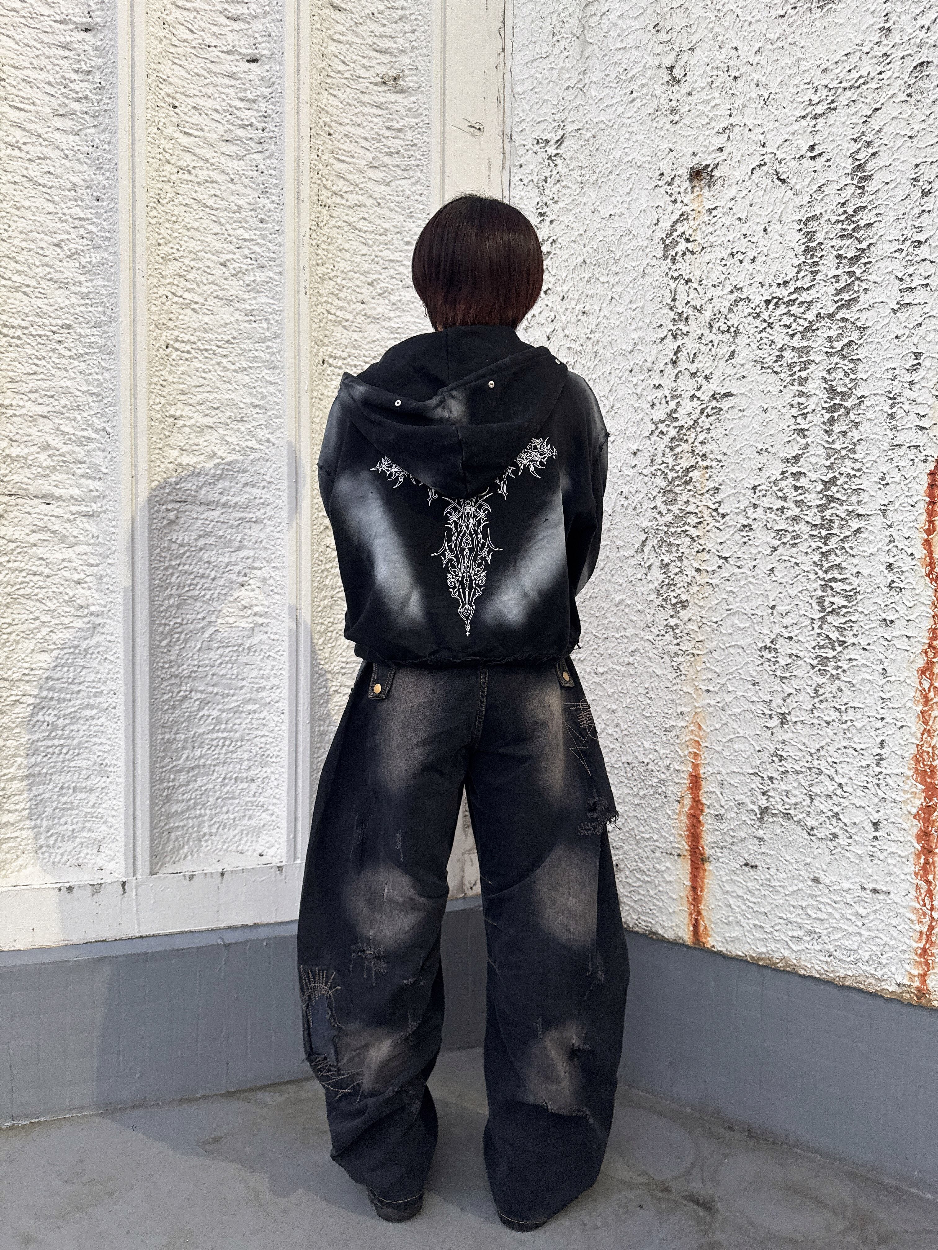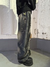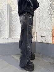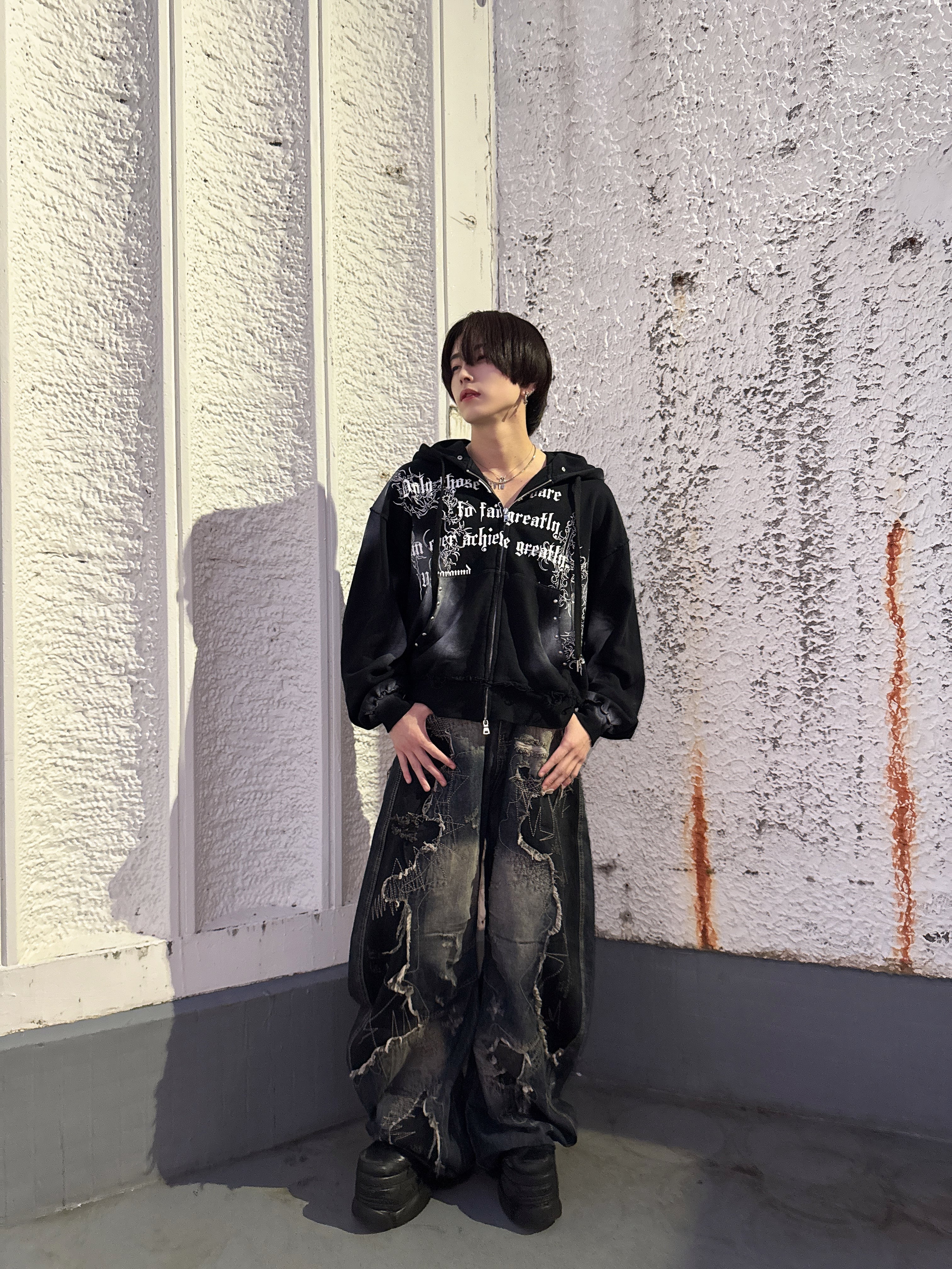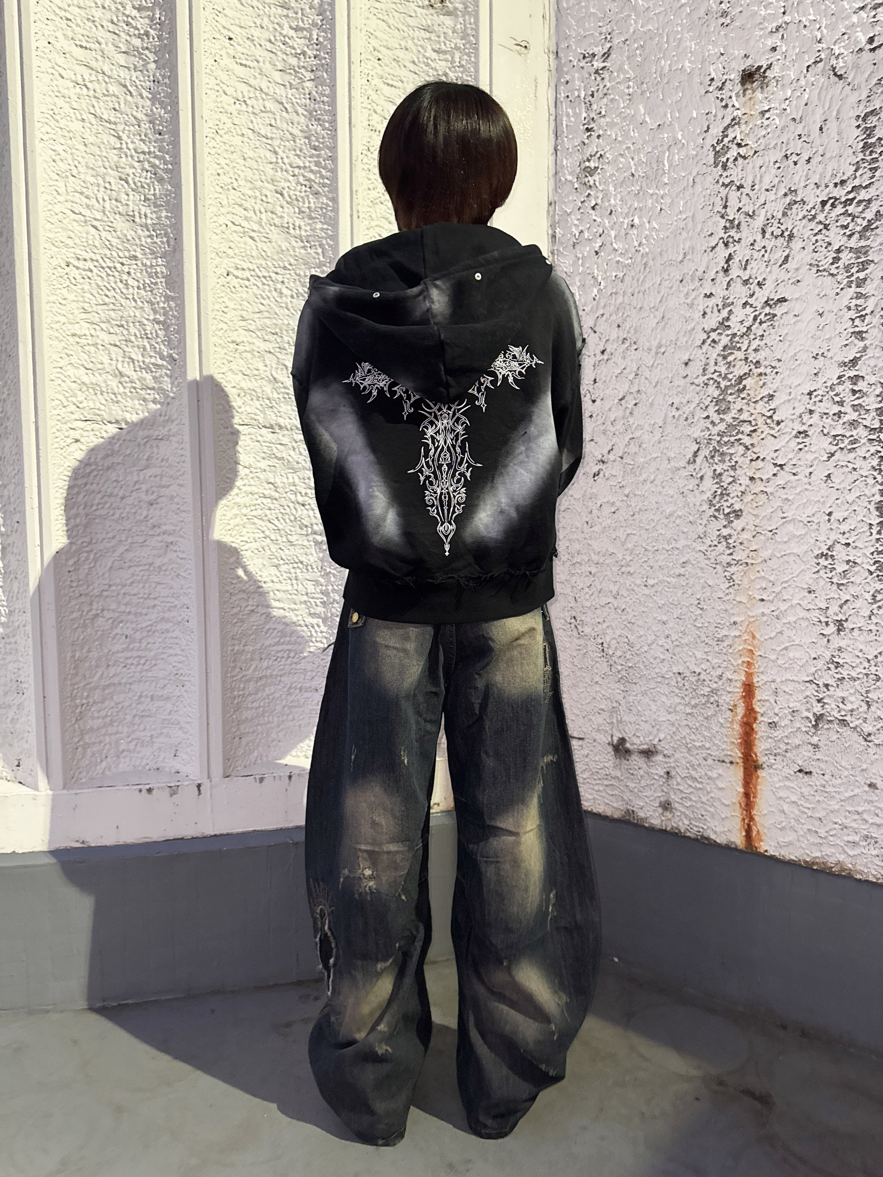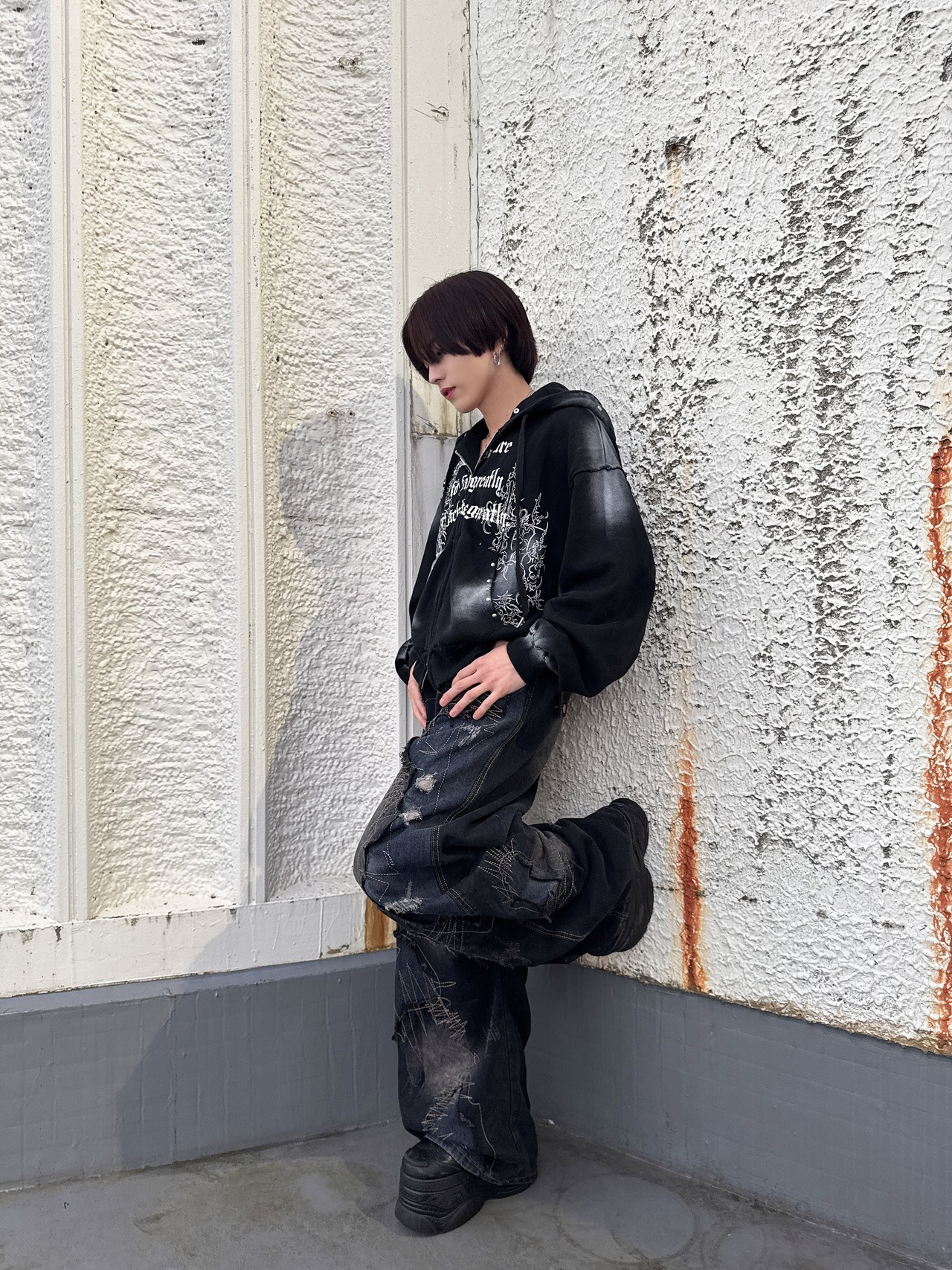 全体に大胆なクラッシュ加工とリメイク風ステッチを施し、ユーズド感のある雰囲気を演出。ヴィンテージライクな色落ちやダメージの入り方が一点一点異なり、スタイリングに個性をプラスします。