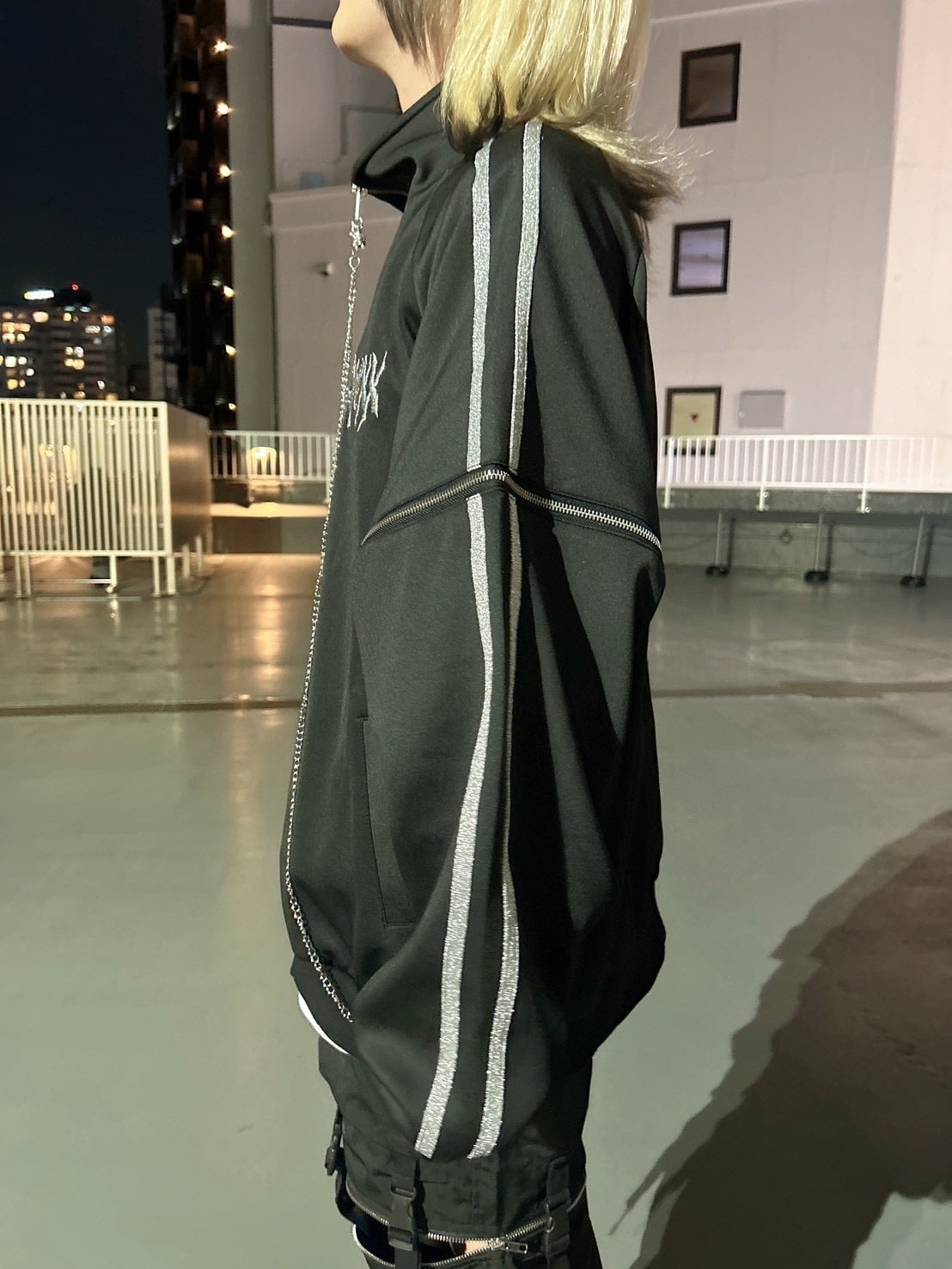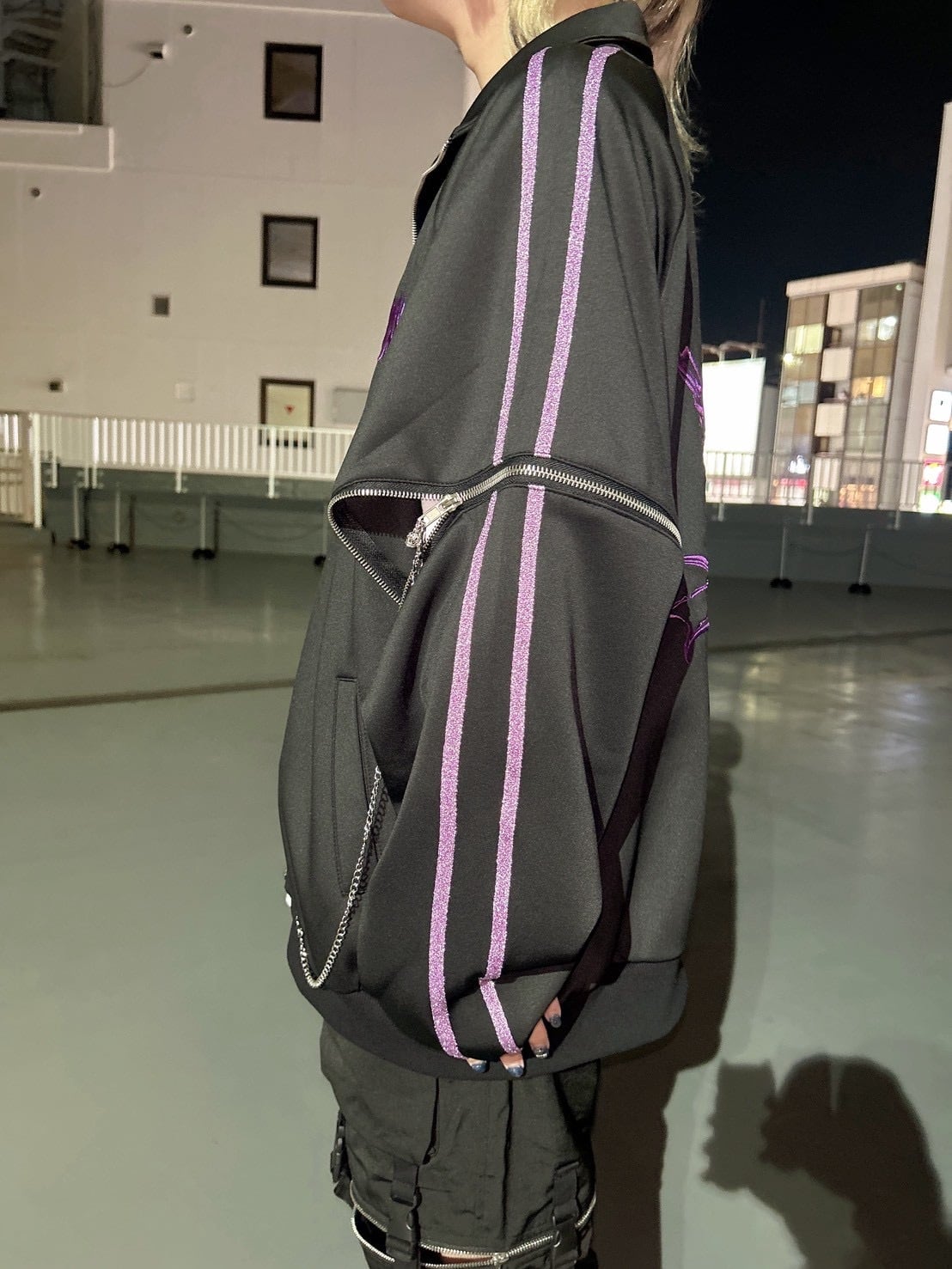 背中に大きくあしらわれたクラウン×有刺鉄線×バットウィングの刺繍が印象的な、存在感抜群のジップアップジャージ。