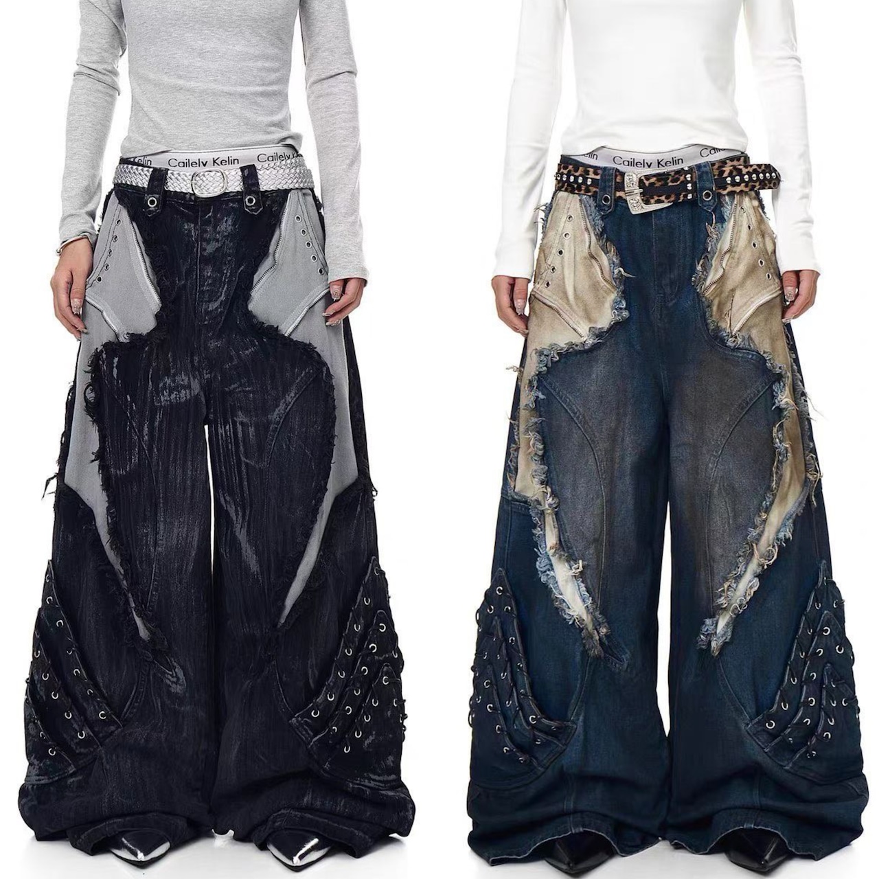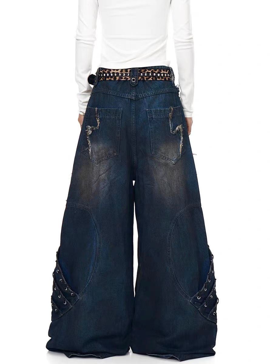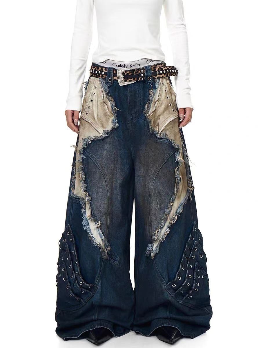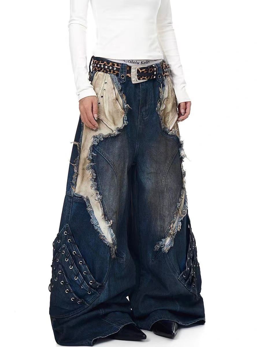 大胆なカットオフと異素材パネル、そしてレースアップデザインが目を引くワイドデニムパンツ。