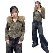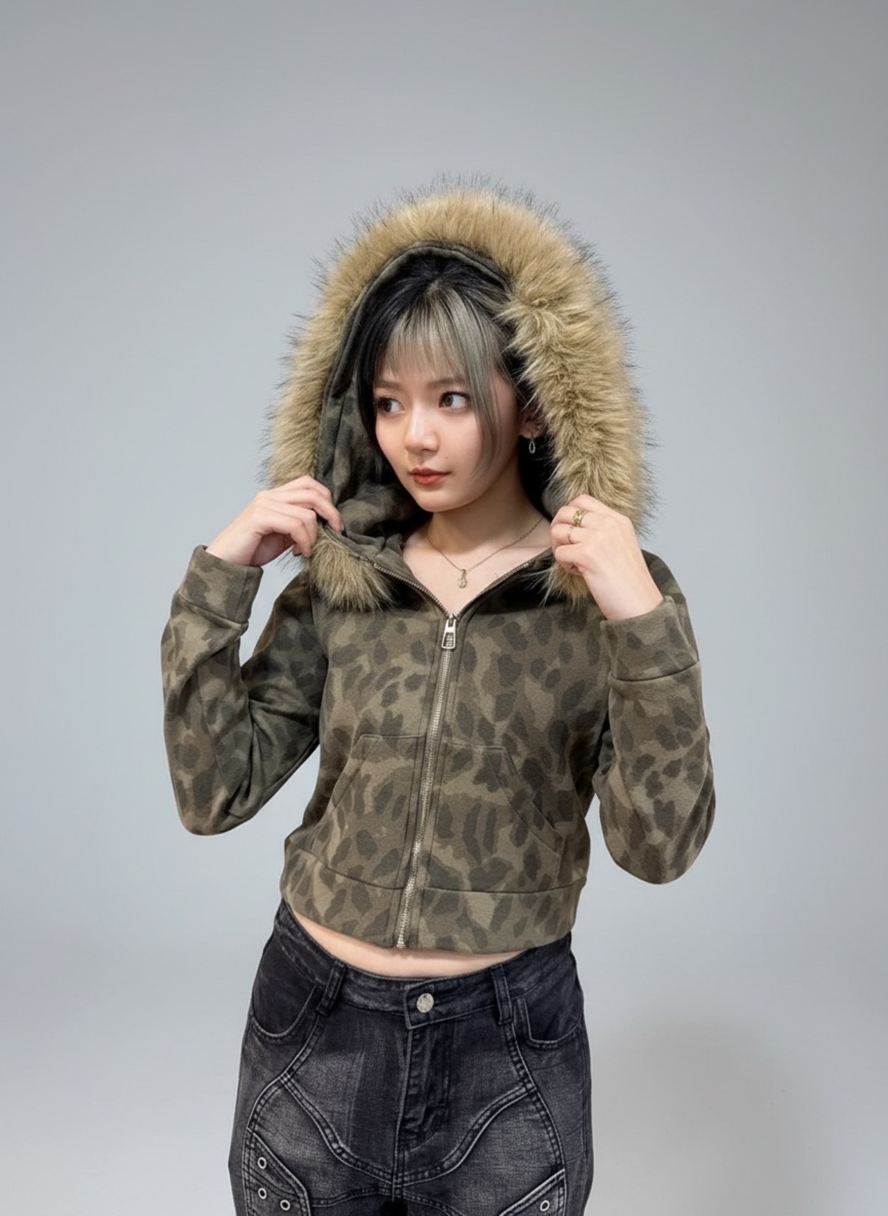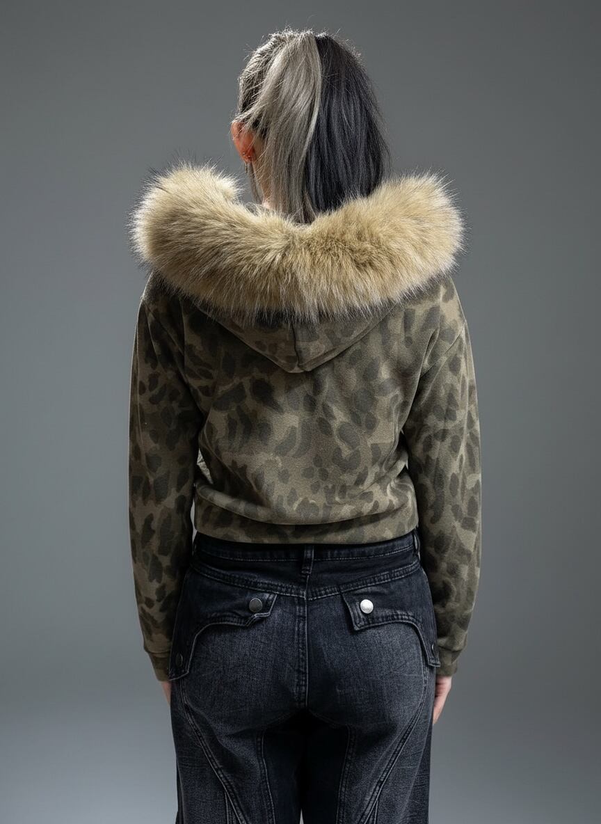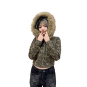 ふわふわのフェイクファーフードが主役の、レオパード柄ショート丈パーカー。