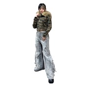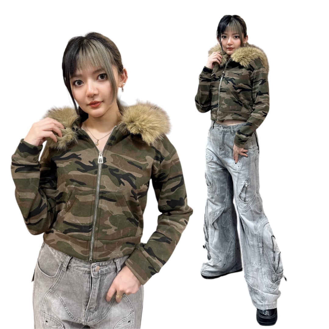 ふわふわのフェイクファーフードが主役の、迷彩柄のショート丈パーカー。