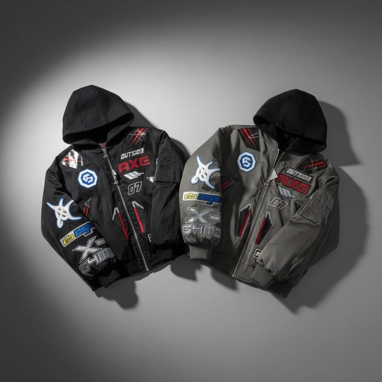 フロント・袖に施された立体刺繍ワッペンが、無骨さと遊び心を同時に演出し、どの角度から見ても印象に残る1着です。