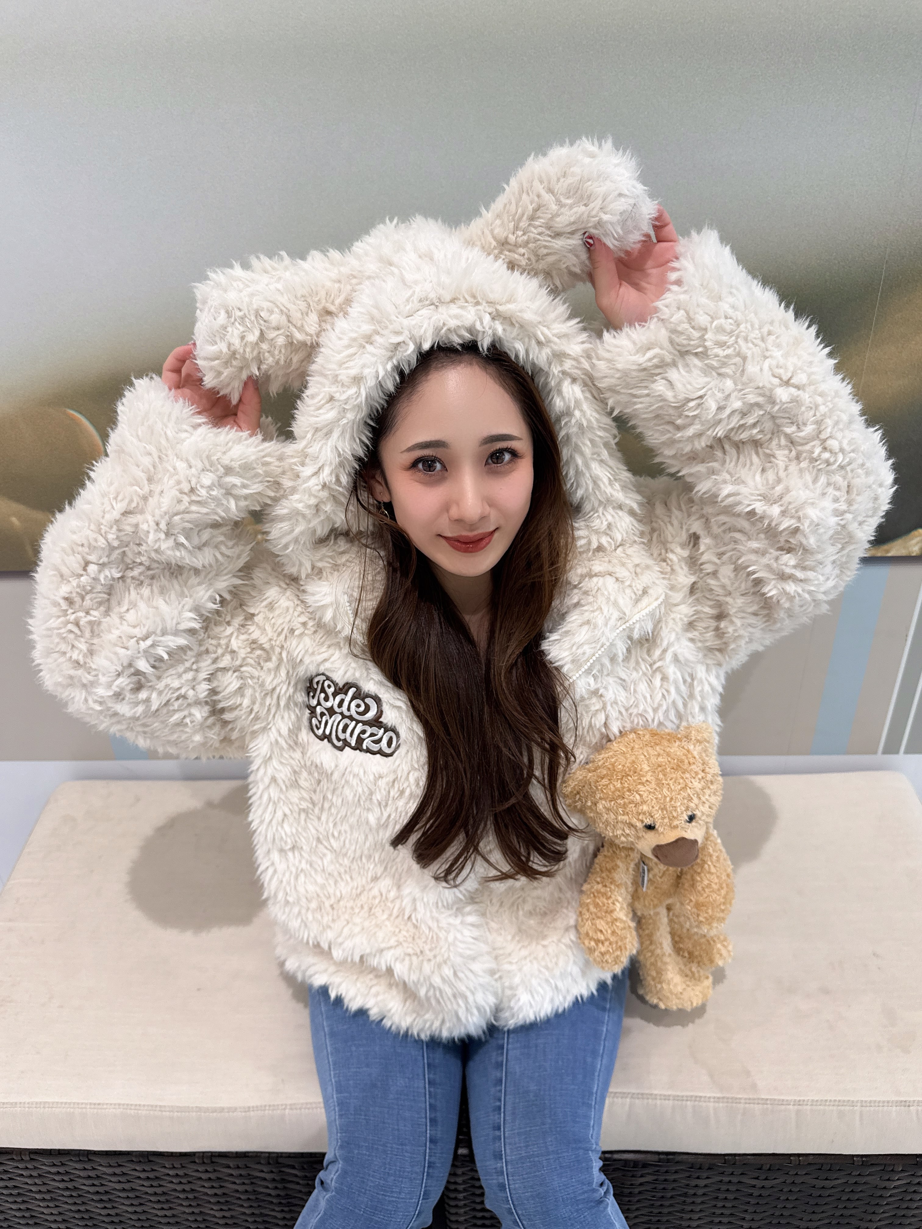 ベア耳付きフードが可愛さをプラスし、羽織るだけで存在感のあるコーデに。