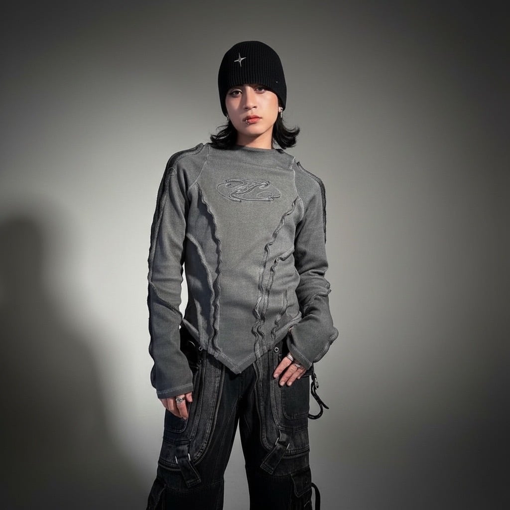 無機質で退廃的なムードを纏う、地雷・サブカルスタイルに刺さるロングスリーブトップス。