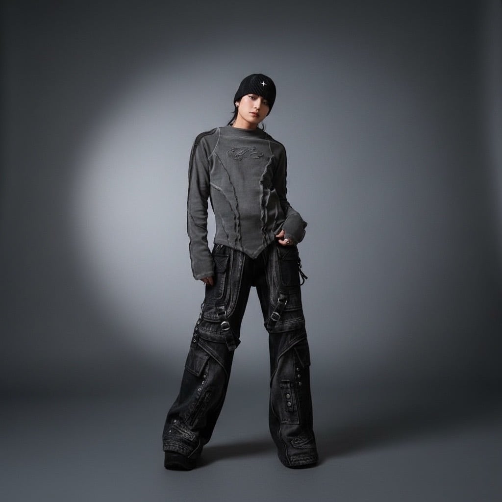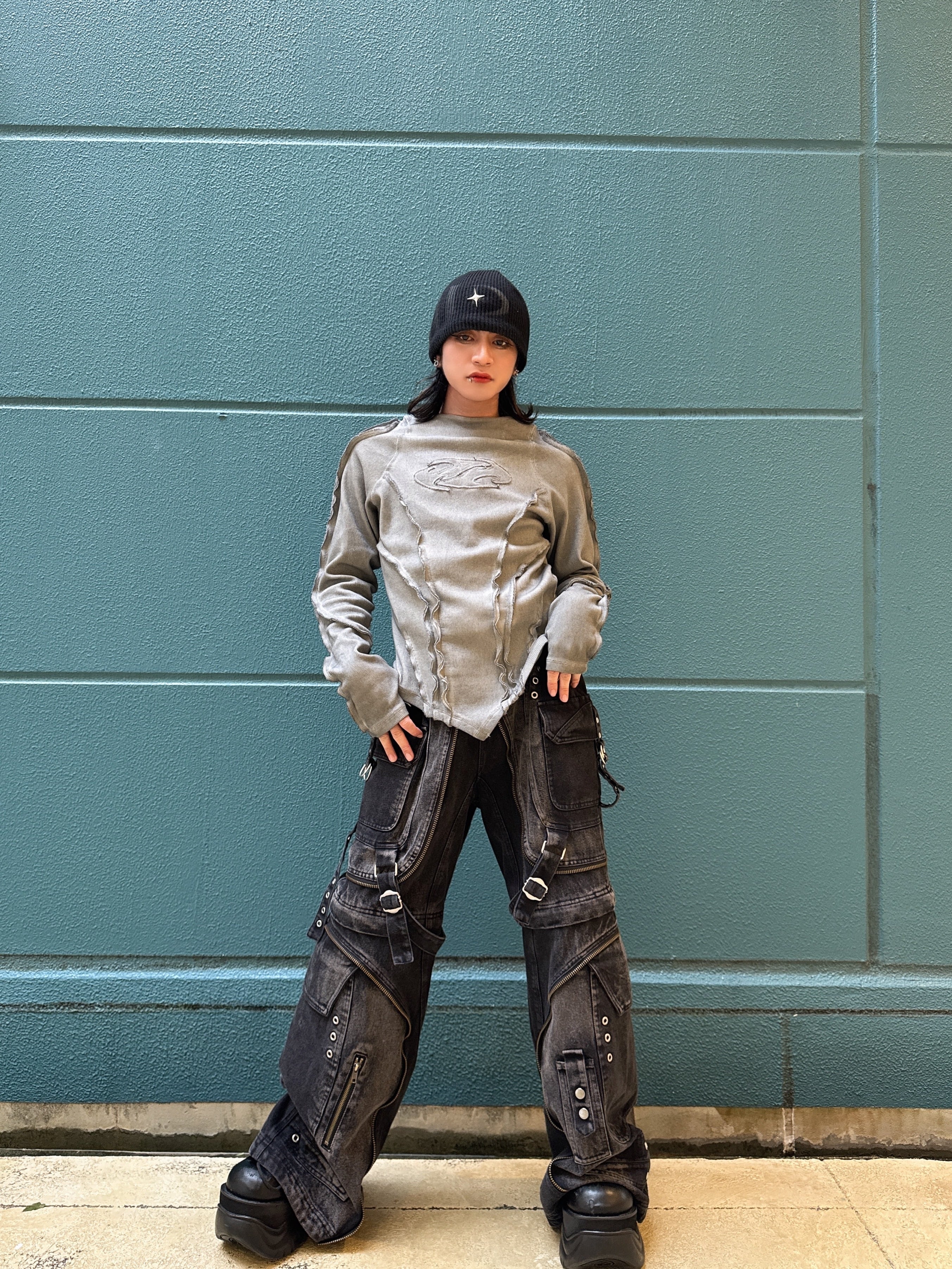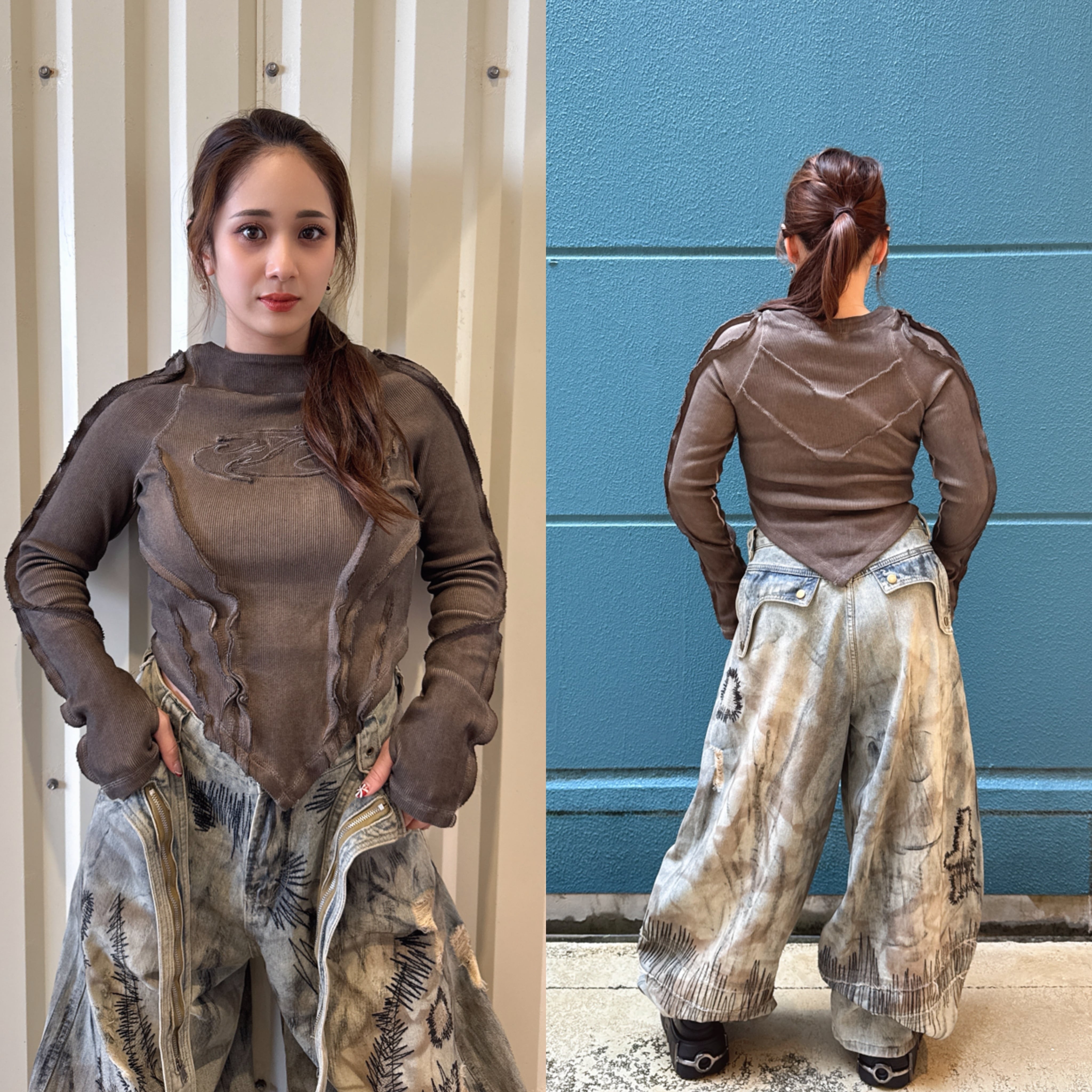 全体に走る立体的なシーム切替と、あえてラフに残したダメージ加工が身体のラインをシャープに演出します。