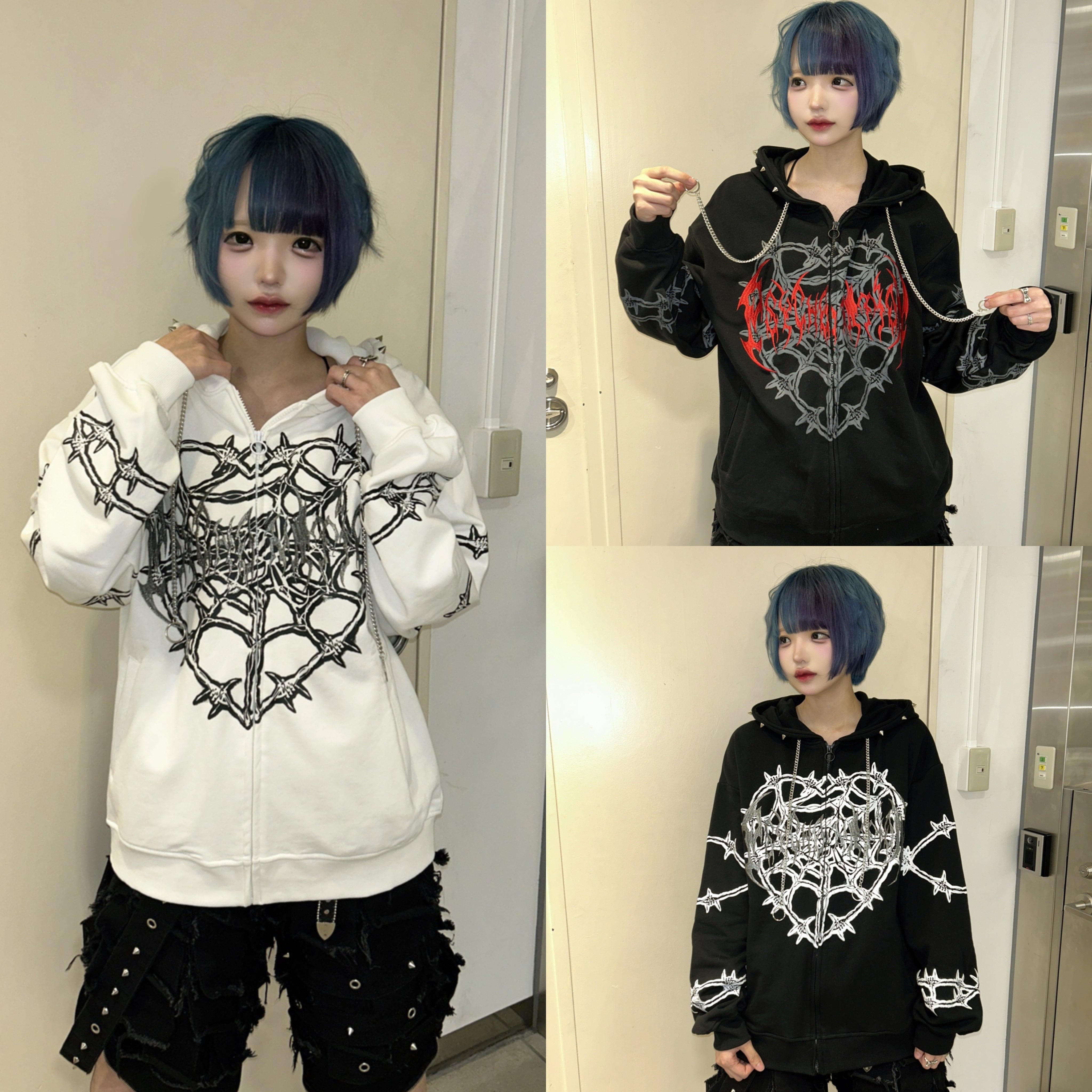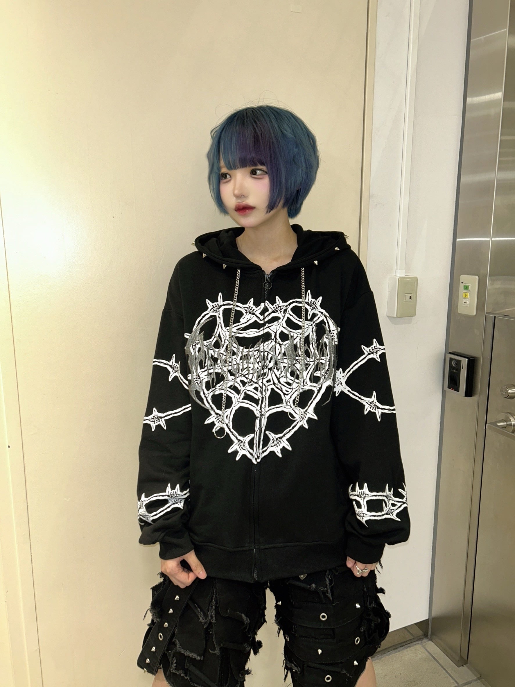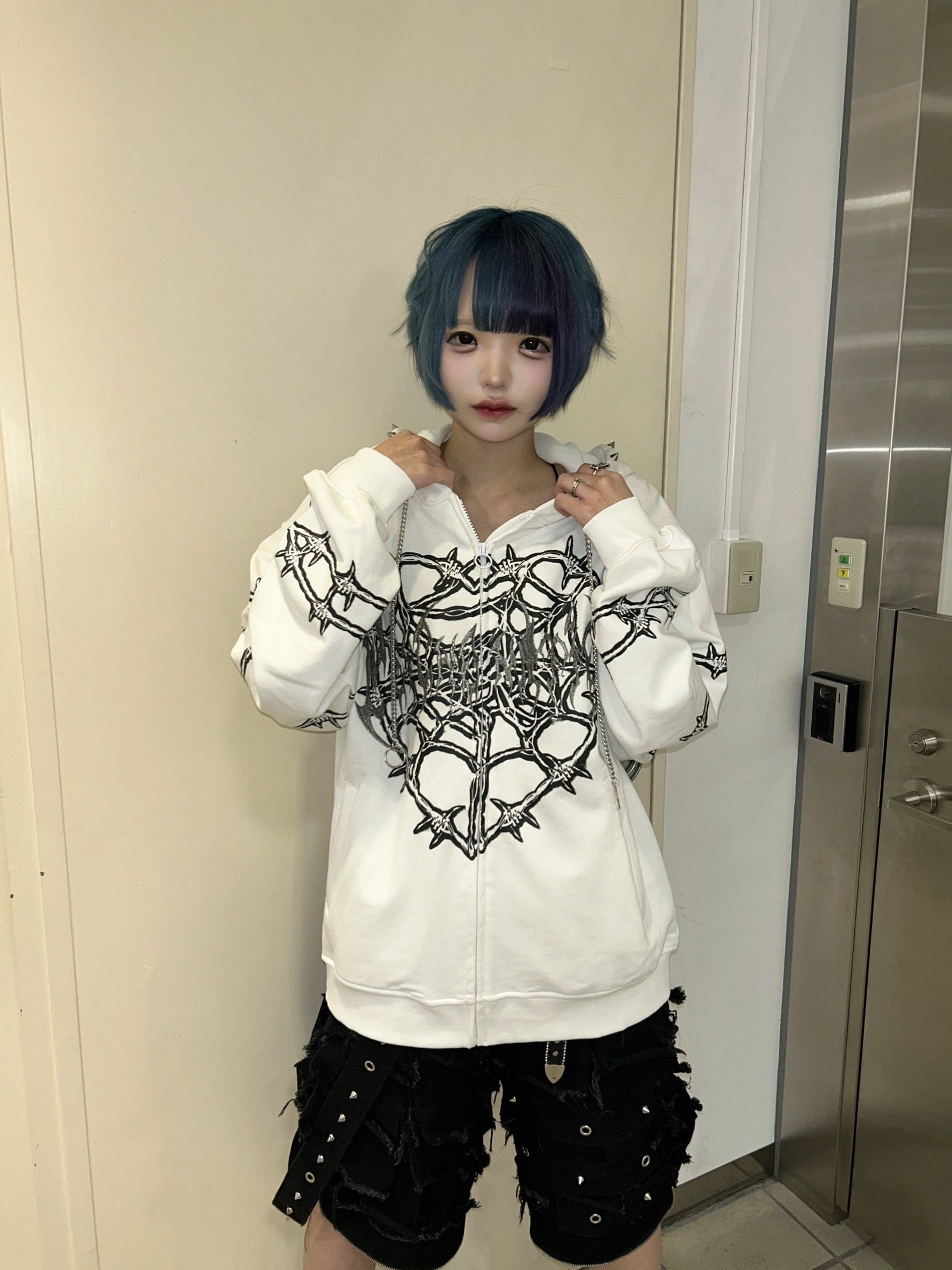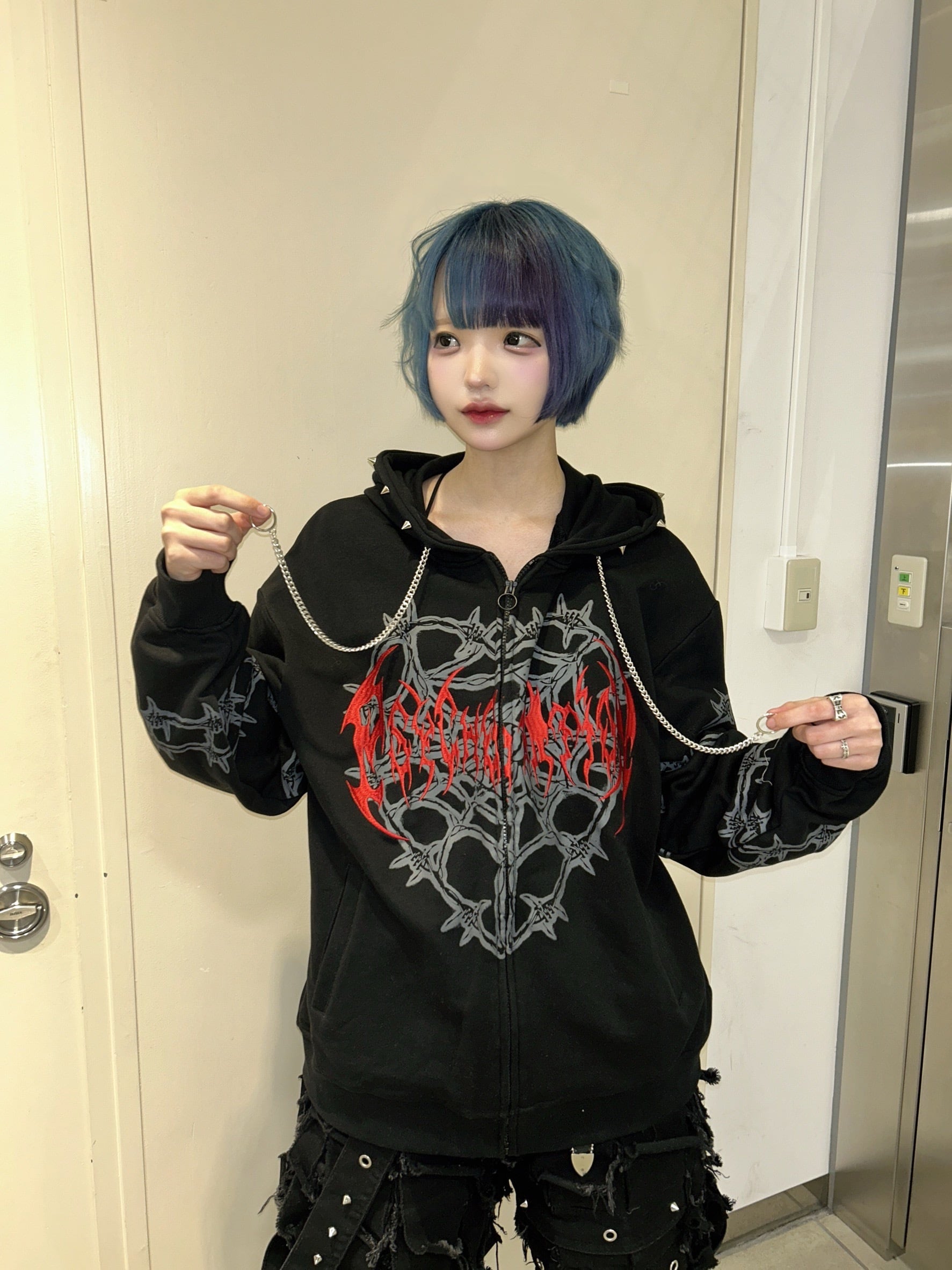 目を引く、サブカル・地雷系スタイルにぴったりなZIPパーカー。フロントから袖まで大胆に配置されたデザインが、コーデの主役になる一枚です。