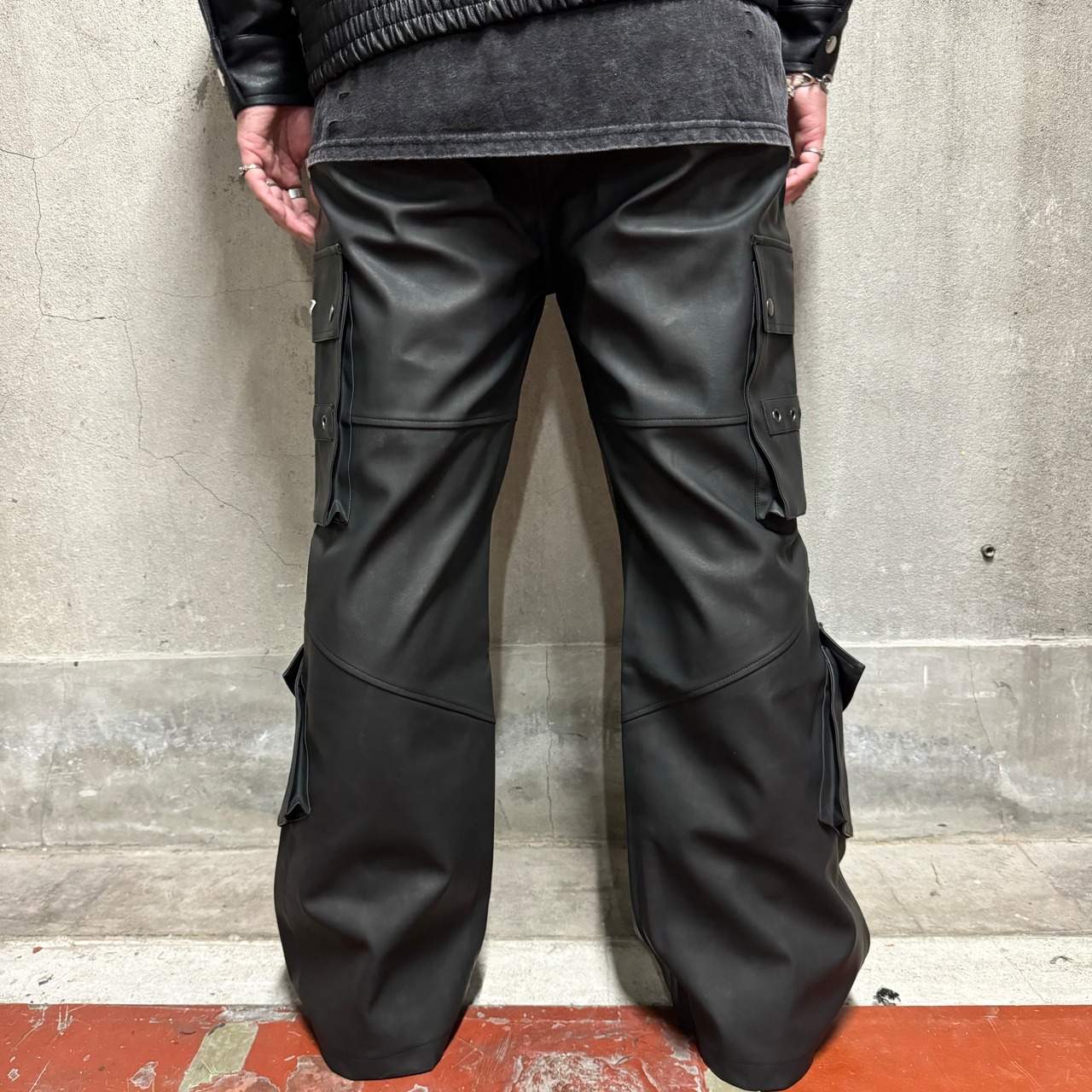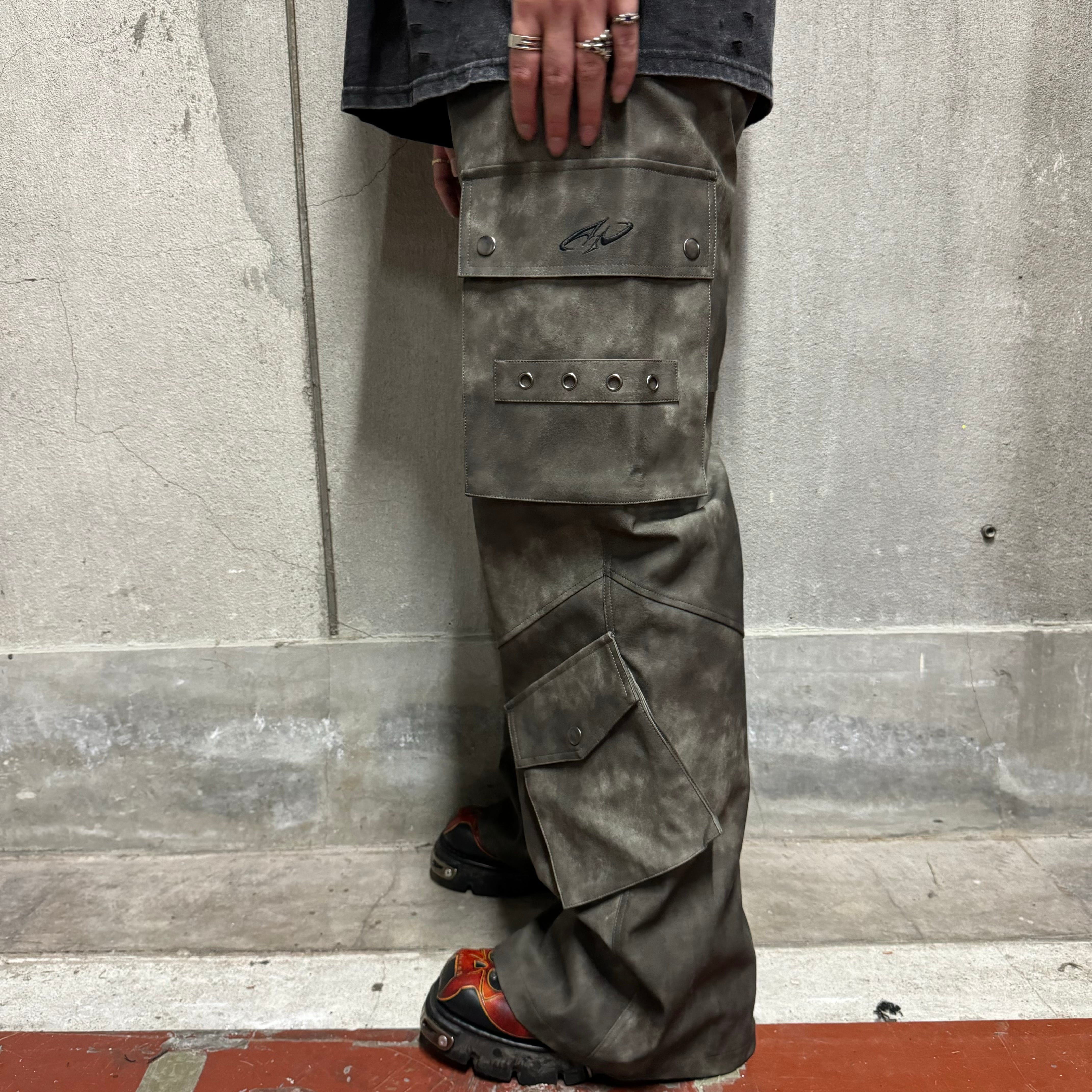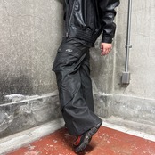 PUレザーのフレアカーゴパンツになります。